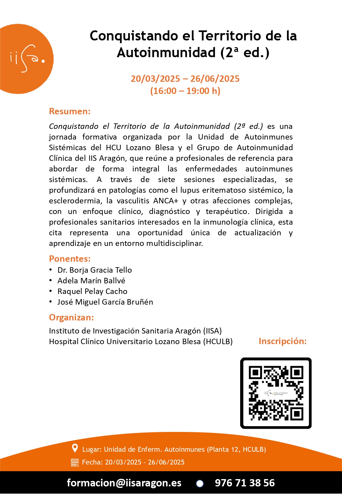 Desde el Instituto de Investigación Sanitaria de Aragón (IIS Aragón) te invitamos a asistir a la jornada «Conquistando el Territorio de la Autoinmunidad (2ª ed.)«, que tendrá lugar en varias sesiones entre el 20 de marzo y el 26 de junio de 2025 a las 16:00 h.
