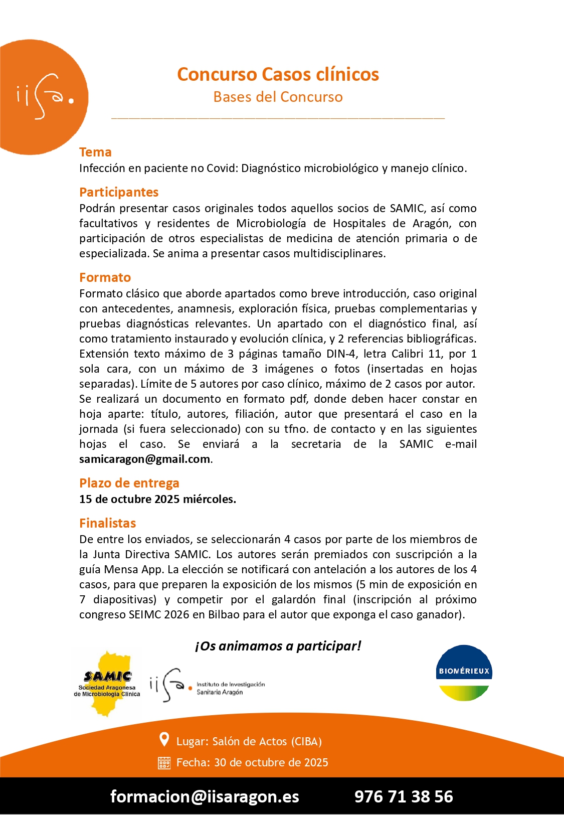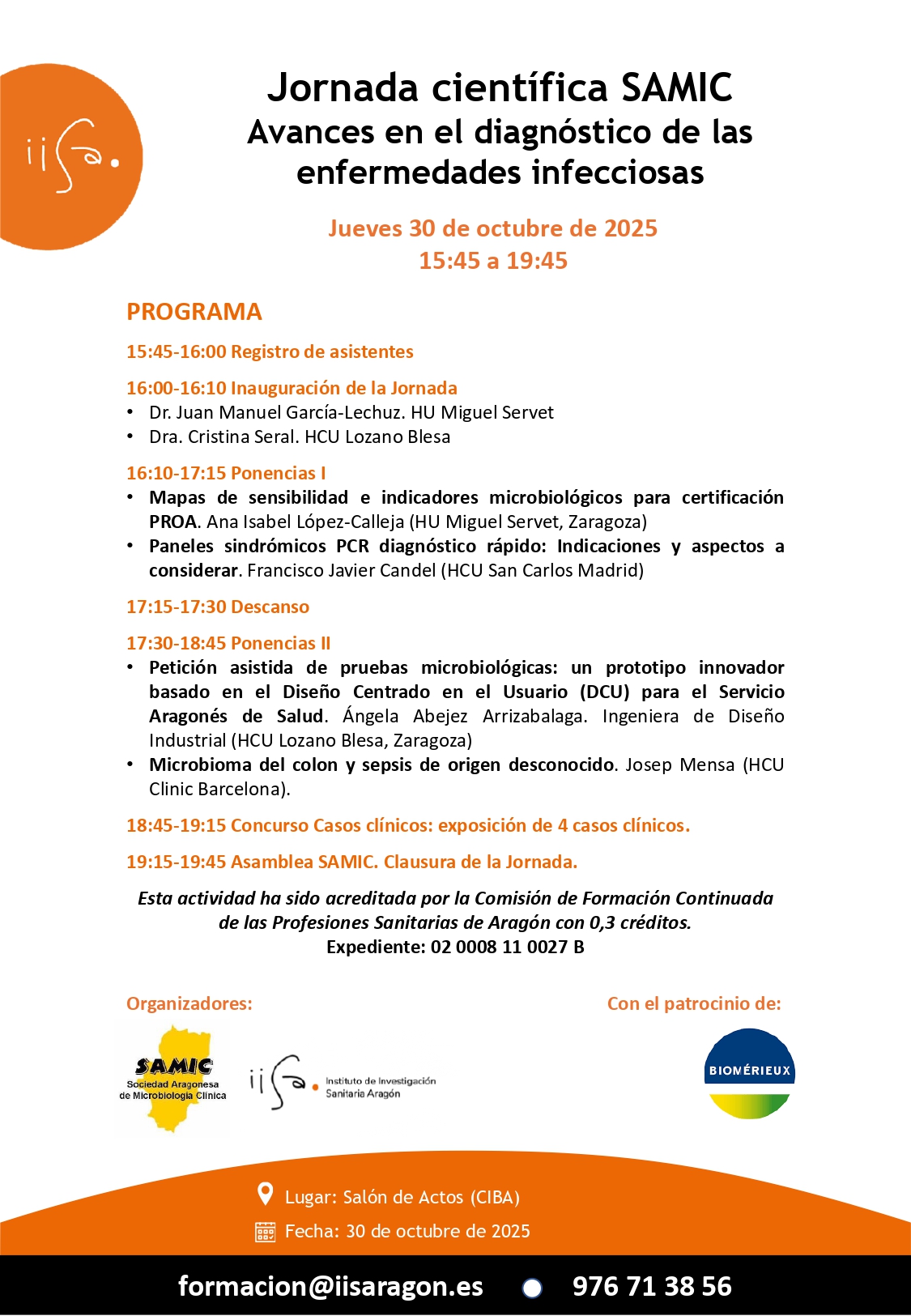 El Instituto de Investigación Sanitaria Aragón (IIS Aragón) en colaboración con el Servicio Aragonés de Microbiología Clínica (SAMIC) organiza el 30 de octubre de 2025 de 15:45 a 19:45 h en el Salón de Actos Lorente de No (CIBA) la Jornada Científica SAMIC – Avances en el diagnóstico de las enfermedades infecciosas. La actividad está patrocinada por BIOMÉRIEUX y ha sido acreditada por la Comisión de Formación Continuada de las Profesiones Sanitarias de Aragón con 0,3 créditos (Expediente: 02 0008 11 0027 B).