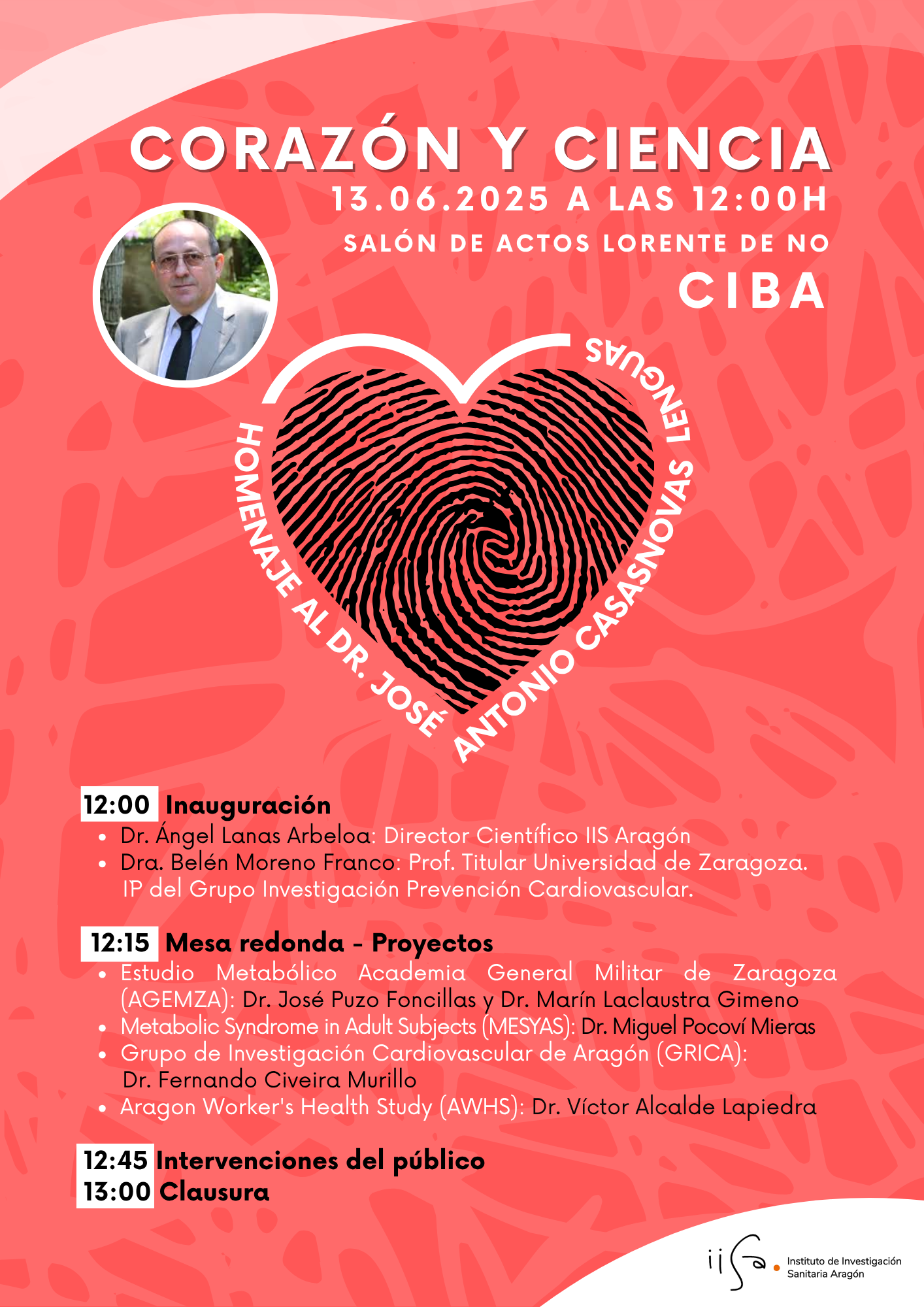 Desde el Instituto de Investigación Sanitaria de Aragón (IIS Aragón) te invitamos a asistir a la Jornada «Corazón y Ciencia: homenaje a José Antonio Casasnovas Lenguas», que tendrá lugar el 13 de junio de 2025. Esta jornada rendirá homenaje a la destacada trayectoria del Dr. José Antonio Casasnovas Lenguas, cuya pasión por la investigación y el conocimiento riguroso, lo convirtieron en un referente dentro de la comunidad científica aragonesa. Durante el evento, se presentará una revisión de sus principales aportes científicos, con especial énfasis en el desarrollo, impacto y proyecciones futuras de los diferentes estudios de los que el Dr. José Antonio Casasnovas Lenguas fue impulsor y referente. Puedes consultar el programa de la jornada a continuación: