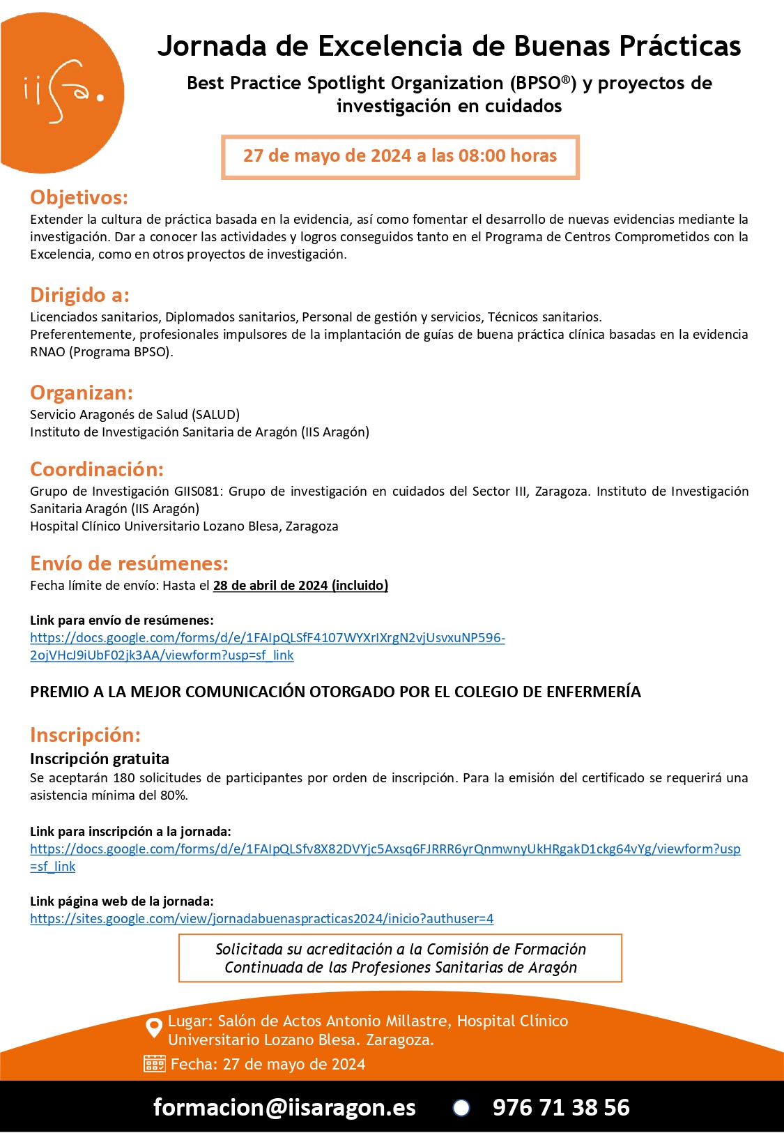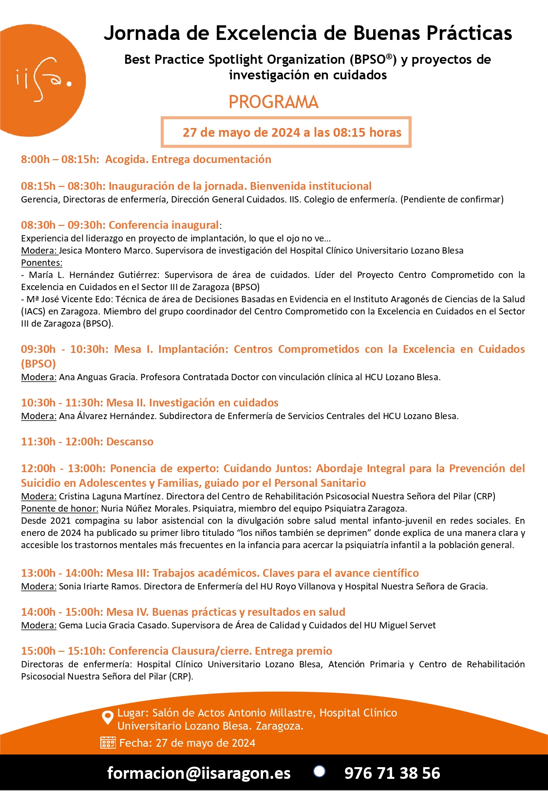 El 27 de mayo de 2024 tendrá lugar la Jornada de Excelencia de Buenas Prácticas: Best Practice Spotlight Organization (BPSO®) y proyectos de investigación en cuidados, en formato presencial (Salón de Actos Antonio Millastre, Hospital Clínico Universitario Lozano Blesa).