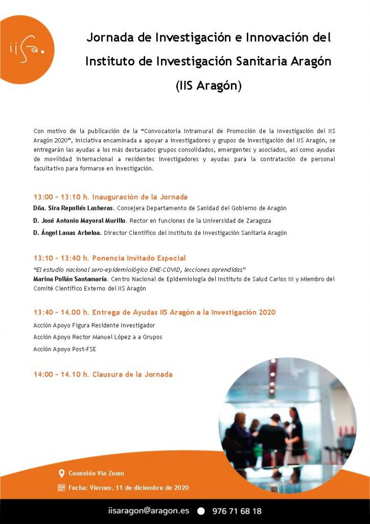 El pasado viernes, 11 de diciembre de 2020 a partir de las 13.00 horas tuvo lugar la Jornada de Investigación e Innovación del Instituto de Investigación Sanitaria Aragón (IIS Aragón), en la que se entregarón las ayudas a los más destacados grupos consolidados, emergentes y asociados, así como ayudas de movilidad internacional a residentes investigadores y ayudas para la contratación de personal facultativo para formarse en investigación.