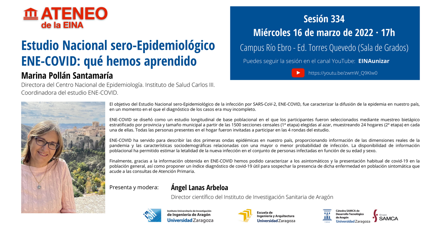 El próximo miércoles 16 de marzo, a las 17 horas, tendrá lugar una nueva sesión del Ateneo de la EINA, protagonizada en esta ocasión por Marina Pollán Santamaría, directora del Centro Nacional de Epidemiología del Instituto de Salud Carlos III y coordinadora del Estudio Nacional sero-Epidemiológico ENE-COVID.