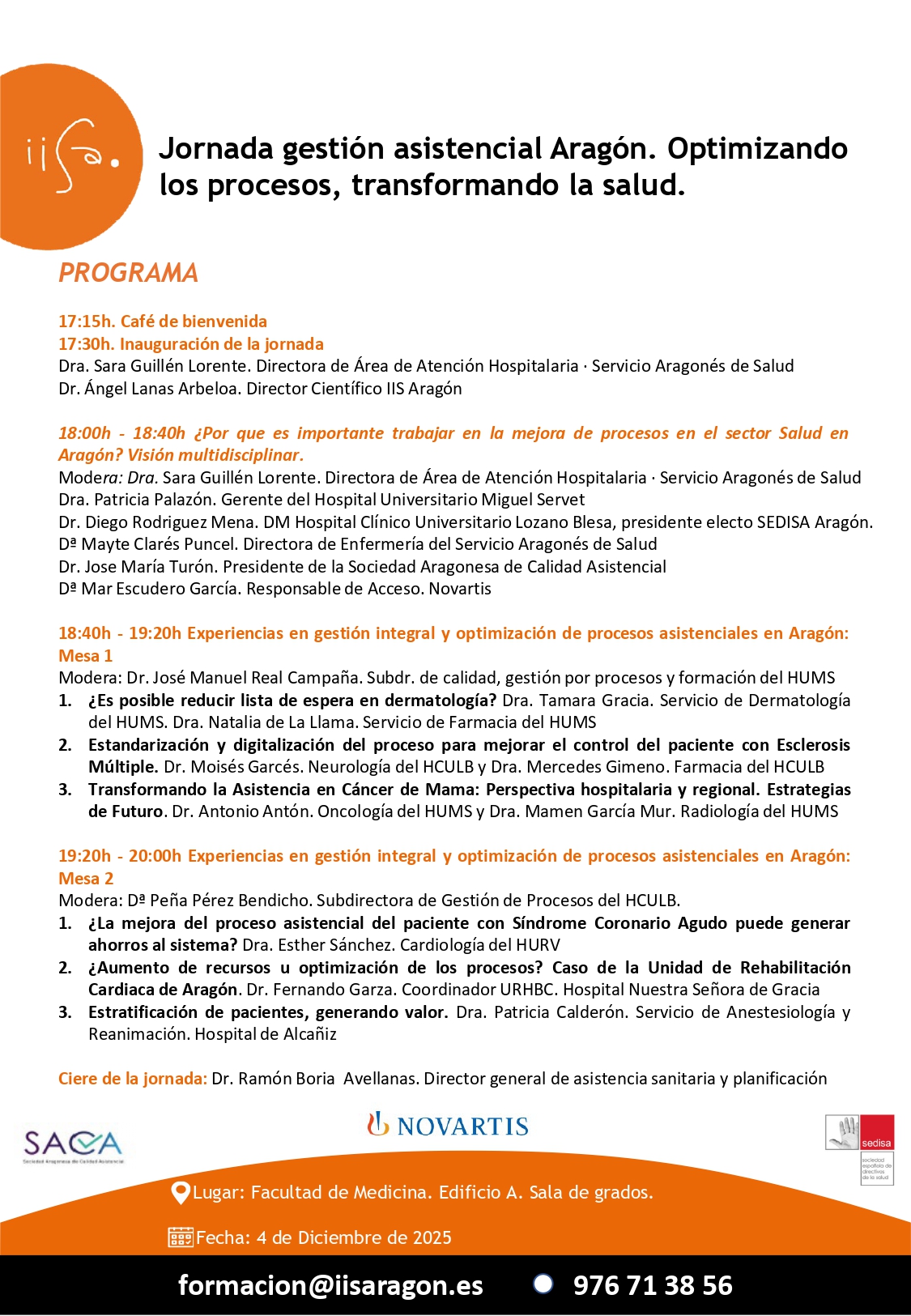 Desde el Instituto de Investigación Sanitaria de Aragón (IIS Aragón) te invitamos a asistir a la jornada «Gestión asistencial en Aragón. Optimizando los procesos, transformando la salud», que tendrá lugar en formato presencial el 04 de diciembre de 2025, de 17:15 a 20:00 h.