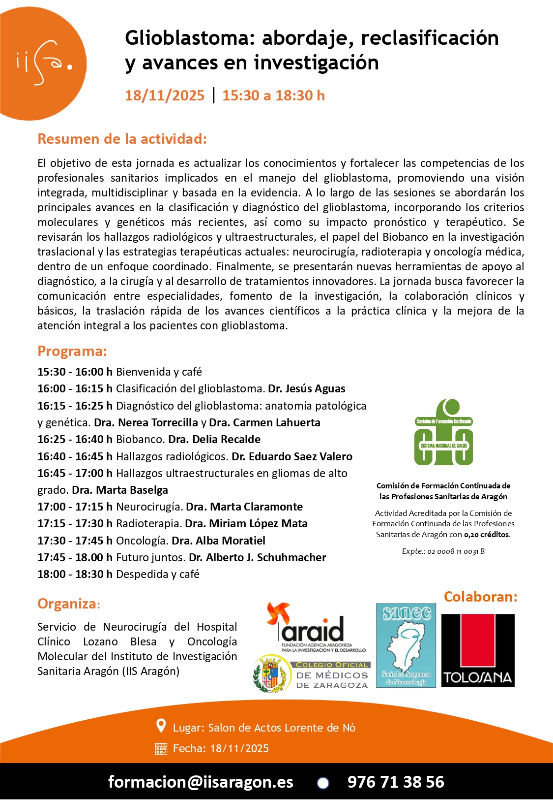 Desde el Instituto de Investigación Sanitaria de Aragón (IIS Aragón) te invitamos a asistir a la jornada «Glioblastoma: abordaje, reclasificación y avances en investigación», que tendrá lugar en formato presencial el 18 de noviembre de 2025, de 15:30 a 18:30 h.