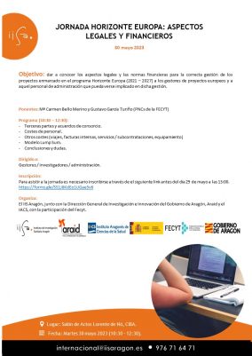 El próximo 30 de mayo de 2023, martes, de 10:30 a 12:30h., tendrá lugar una jornada presencial en el Centro de Investigación Biomédica de Aragón organizada por el IIS Aragón en colaboración con la Dirección General de Investigación e Innovación del Gobierno de Aragón, Araid y el IACS con el título de «Horizonte Europa: Aspectos legales y financieros».