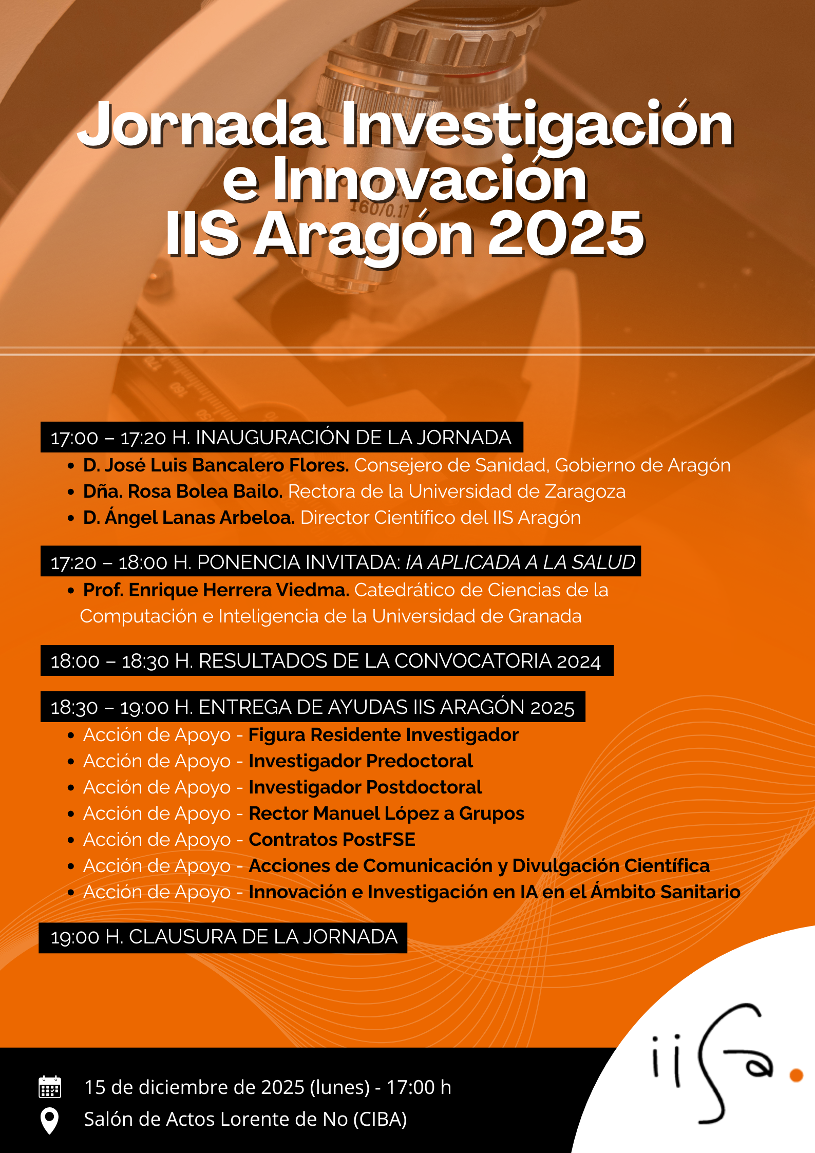 Con motivo de la publicación de la “Convocatoria Intramural de Promoción de la Investigación del IIS Aragón 2025”, iniciativa encaminada a apoyar a investigadores y grupos de investigación del IIS Aragón, se entregarán las ayudas a los más destacados grupos emergentes, así como ayudas de movilidad a residentes investigadores e investigadores predoctorales y postdoctorales, ayudas para la contratación de personal facultativo para formarse en investigación, ayudas a acciones de comunicación y divulgación de la investigación y ayudas a acciones de innovación e investigación en IA en el ámbito asistencial.
