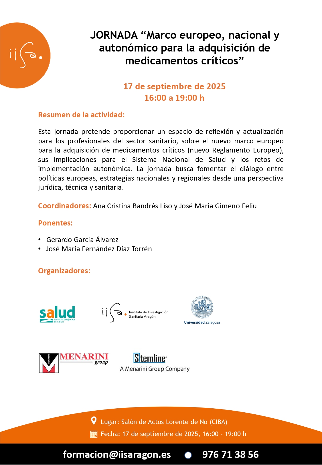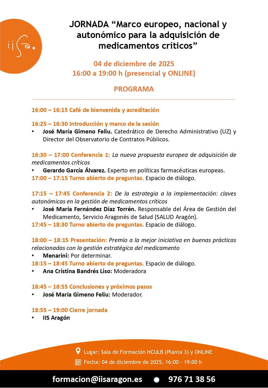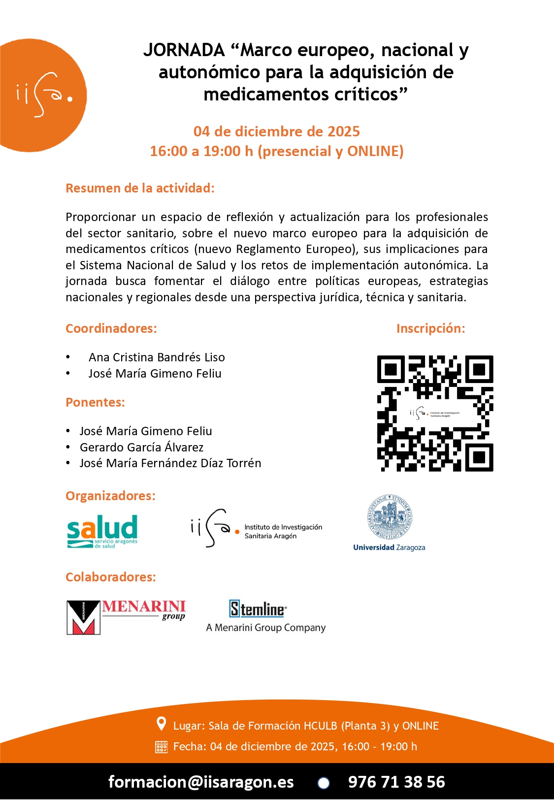 Desde el Instituto de Investigación Sanitaria de Aragón (IIS Aragón) te invitamos a asistir a la jornada «Marco europeo, nacional y autonómico para la adquisición de medicamentos críticos», que tendrá lugar en formato presencial y online el 04 de diciembre de 2025, de 16:00 a 19:00 h.