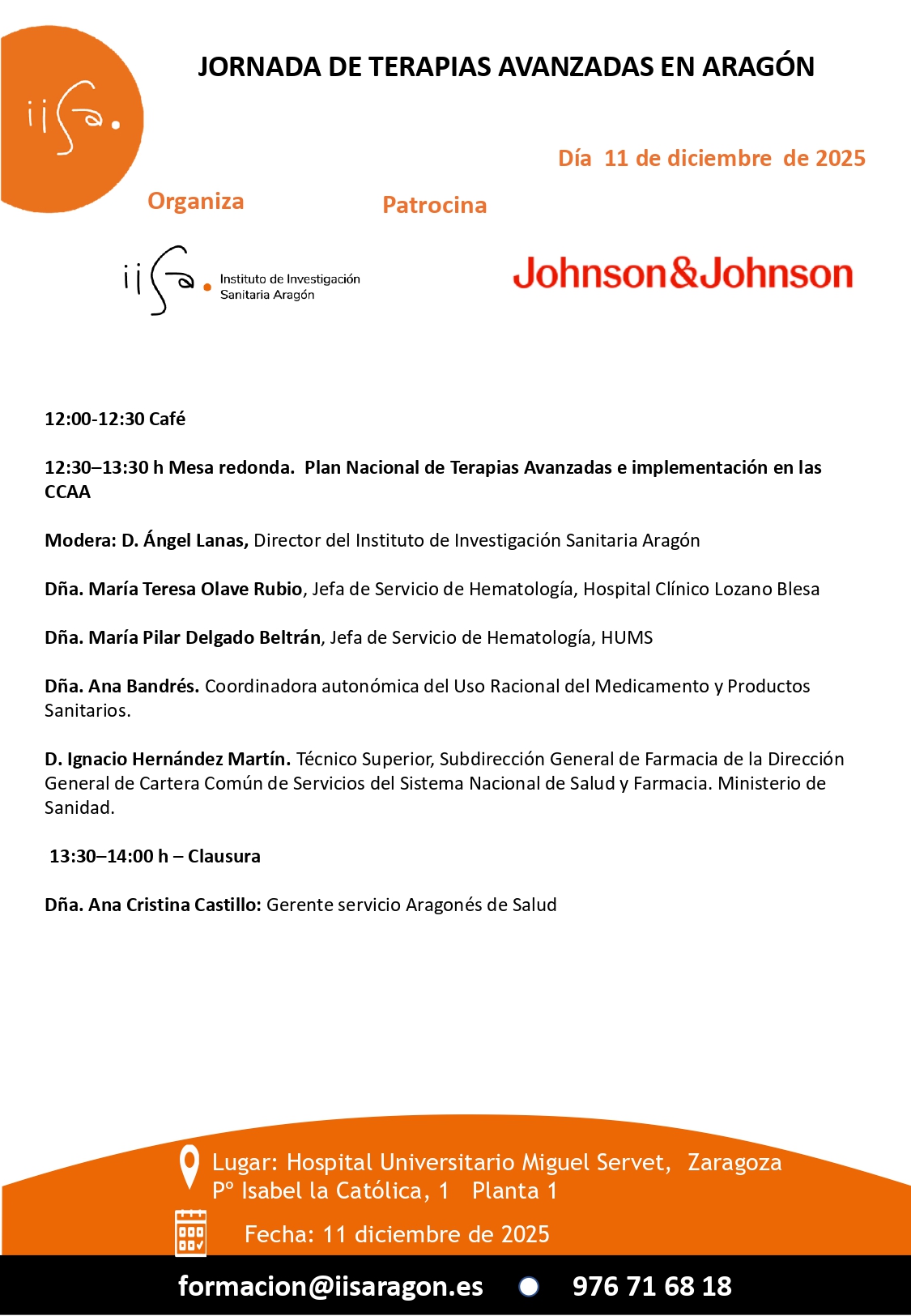 Desde el Instituto de Investigación Sanitaria de Aragón (IIS Aragón) te invitamos a asistir a la jornada «Terapias Avanzadas en Aragón», que tendrá lugar en formato presencial el 11 de diciembre de 2025, de 10:00 a 14:00 h.