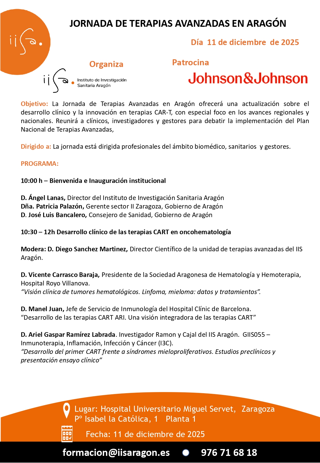 Desde el Instituto de Investigación Sanitaria de Aragón (IIS Aragón) te invitamos a asistir a la jornada «Terapias Avanzadas en Aragón», que tendrá lugar en formato presencial el 11 de diciembre de 2025, de 10:00 a 14:00 h.