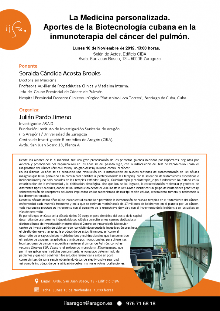 El próximo lunes, 18 de Noviembre a las 13.00 horas tendrá lugar el Seminario Biomédico «La Medicina personalizada. Aportes de la Biotecnología cubana en la inmunoterapia del cáncer del pulmón”, impartido por la Dra. Soraida Cándida Acosta Brooks.