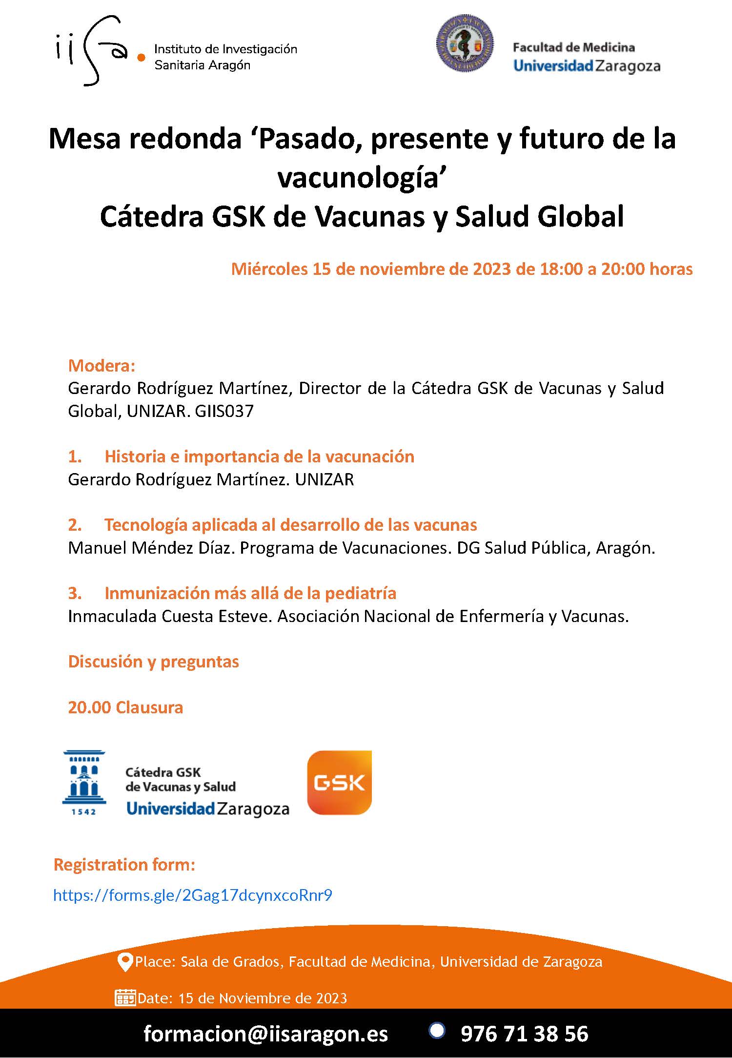 El Instituto de Investigación Sanitaria Aragón en colaboración con la Catedra GSK de Vacunas y Salud de la Universidad de Zaragoza organizan el Miércoles 15 de noviembre de 2023 de 18:00 a 20:00 horas la Mesa redonda «Pasado, presente y futuro de la vacunología» Cátedra GSK de Vacunas y Salud Global