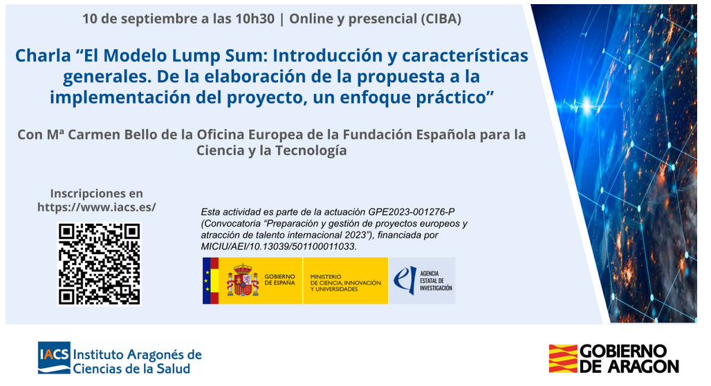 La Oficina de Proyectos del Instituto Aragonés de Ciencias de la Salud (IACS) retoma en septiembre el ciclo “Horizonte Europa a tu alcance”. Ya están abiertas las inscripciones a la cuarta charla del ciclo, «Modelo Lump Sum: Introducción y características generales. De la elaboración de la propuesta a la implementación del proyecto, un enfoque práctico».