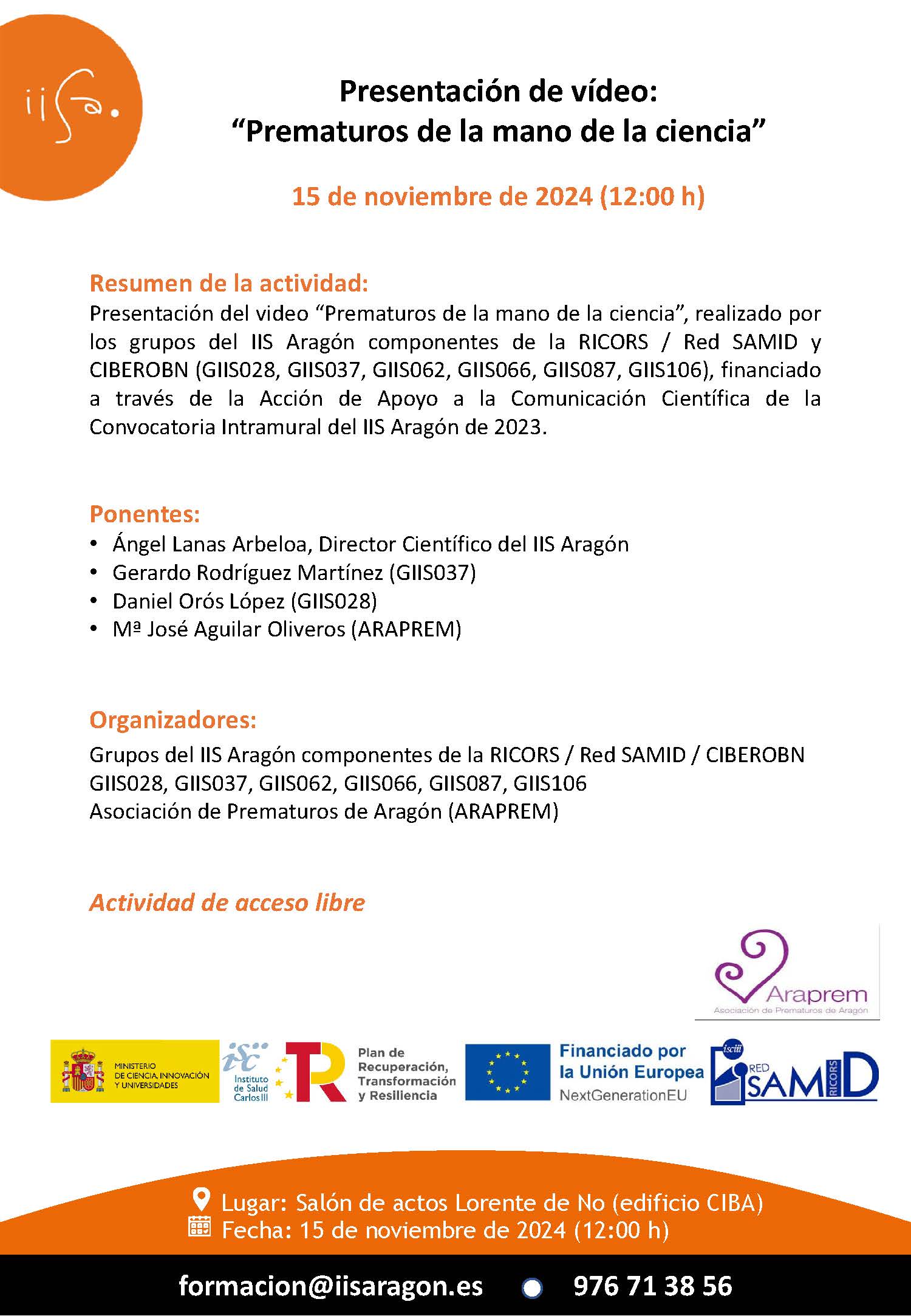 El próximo viernes 15 de noviembre de 2024 a las 12.00 se realizará la Presentación del vídeo: “Prematuros de la mano de la ciencia”, elaborado por los grupos del IIS Aragón componentes de la RICORS / Red SAMID / CIBEROBN (GIIS 028, GIIS 037, GIIS 062, GIIS 066, GIIS087, GIIS 106), financiado a través de la Acción de Apoyo a la Comunicación Científica de la Convocatoria Intramural del IIS Aragón de 2023. El evento es de acceso libre, por lo que os animamos a asistir si es de vuestro interés.
