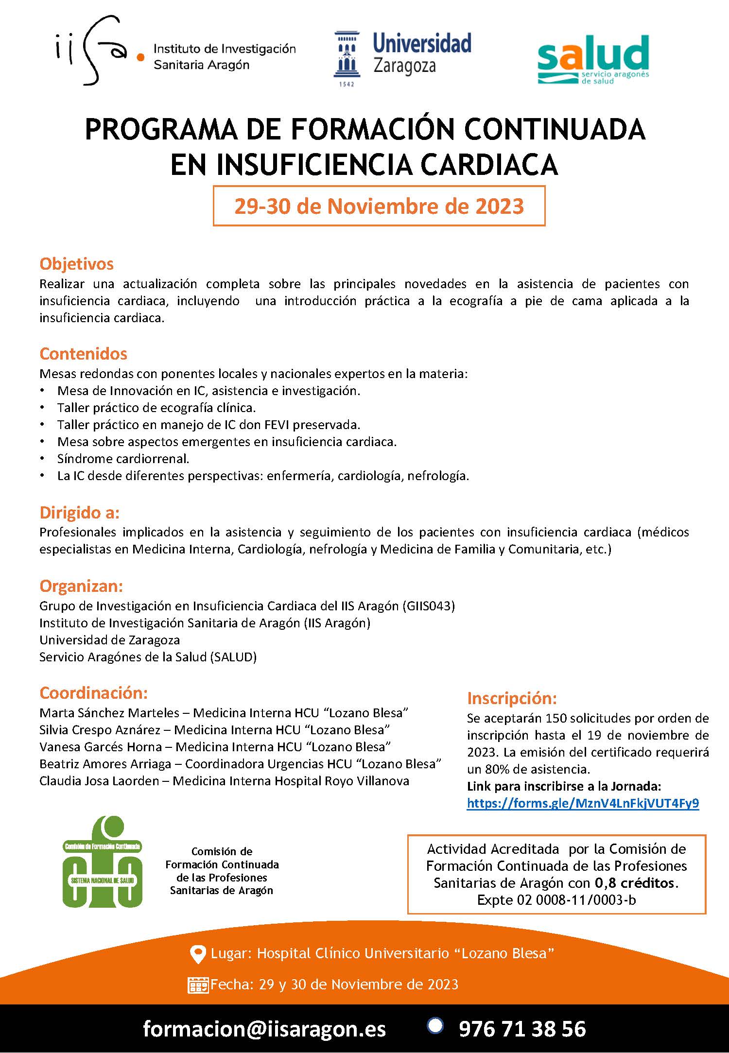 El Instituto de Investigación Sanitaria Aragón en colaboración con el Servicio Aragonés de Salud y la Universidad de Zaragoza organizan el miércoles 29 y jueves 30 de noviembre el Programa de Formación Continuada en Insuficiencia Cardíaca. 2ª Edición en el Hospital Clínico Universitario «Lozano Blesa», Zaragoza