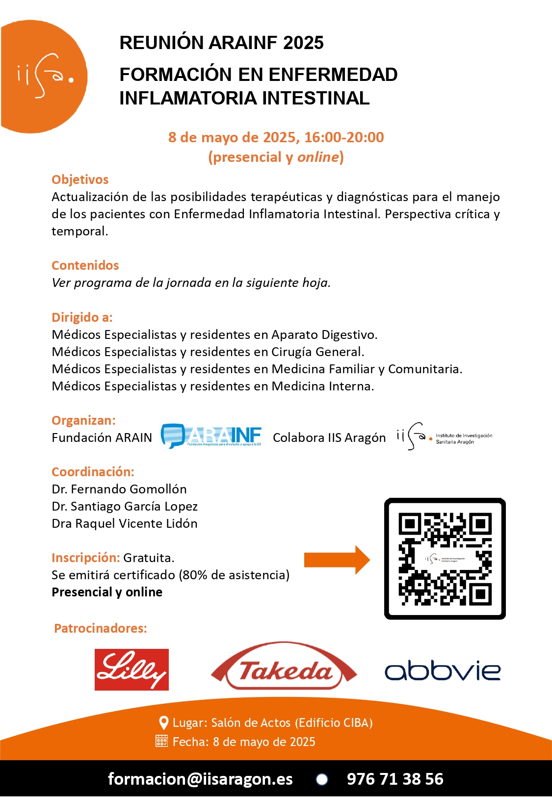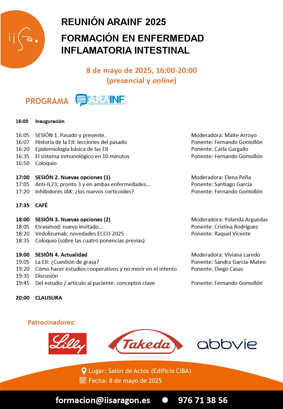 Desde el Instituto de Investigación Sanitaria de Aragón (IIS Aragón) te invitamos a asistir a la REUNIÓN ARAINF 2025 – Formación en enfermedad inflamatoria intestinal, que tendrá lugar el 08 de mayo de 2025 en el Salón de Actos del CIBA y ONLINE. Puedes consultar el programa de la jornada a continuación: