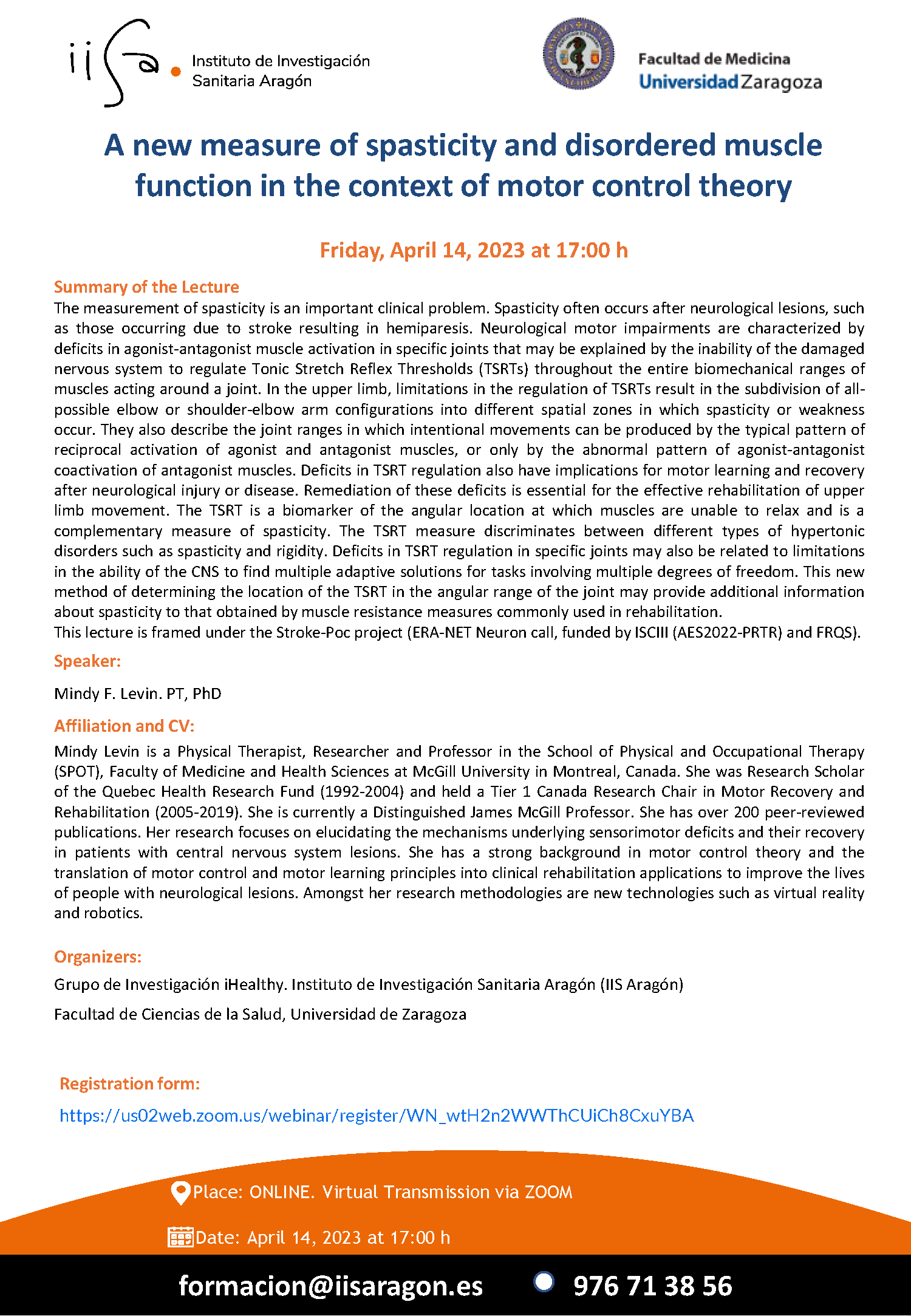El Instituto de Investigación Sanitaria Aragón en colaboración con la Universidad de Zaragoza organizan el 14 de abril 2023 el Seminario Biomédico «A new measure of spasticity and disordered muscle function in the context of motor control theory».