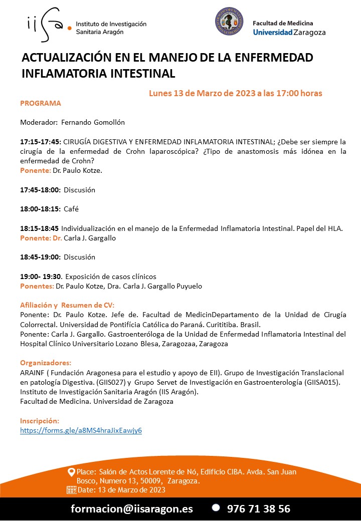 Organizadores: ARAINF ( Fundación Aragonesa para el estudio y apoyo de EII), Grupo de Investigación Translacionalen patología Digestiva, (GIIS027) y Grupo Servet de Investigación en Gastroenterología (GIISA015), Instituto de Investigación Sanitaria Aragón (IIS Aragón) y Facultad de Medicina, Universidad de Zaragoza