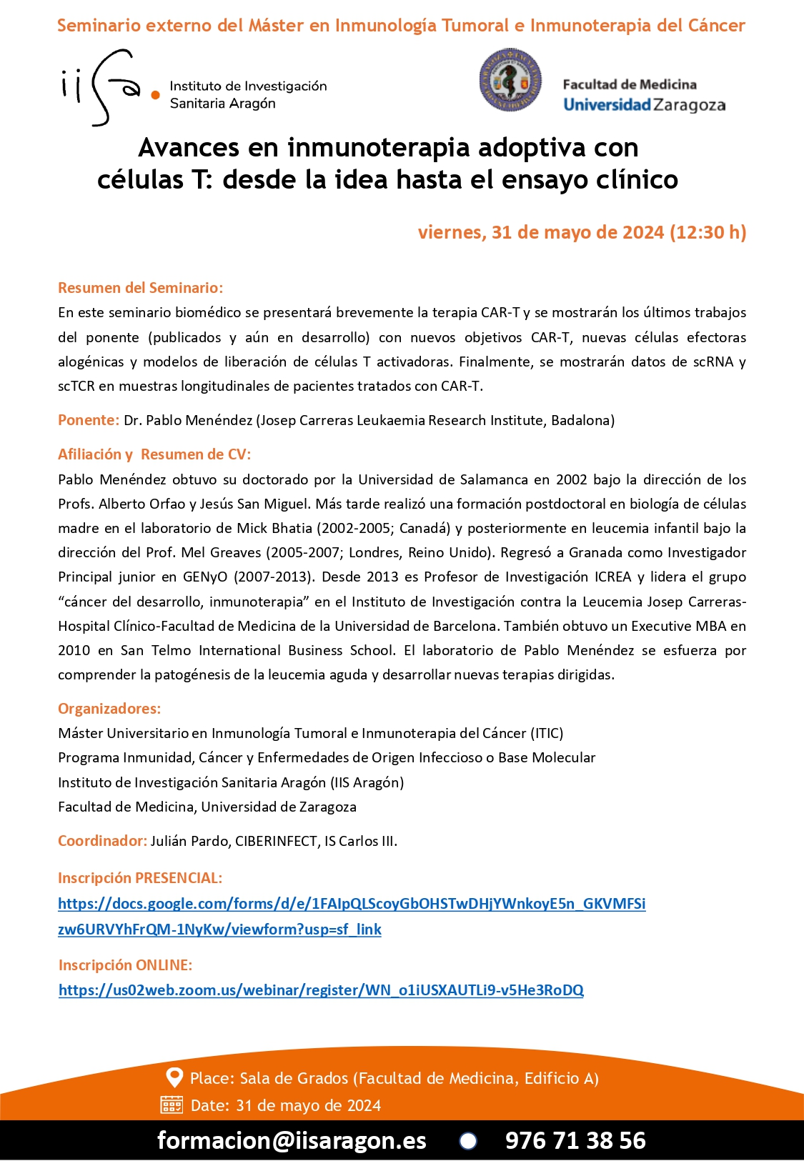 El Instituto de Investigación Sanitaria Aragón, en colaboración con el Máster en Inmunología Tumoral e Inmunoterapia del Cáncer de la Universidad de Zaragoza, organizan el SEMINARIO BIOMÉDICO “Avances en inmunoterapia adoptiva con células T: desde la idea hasta el ensayo clínico”.