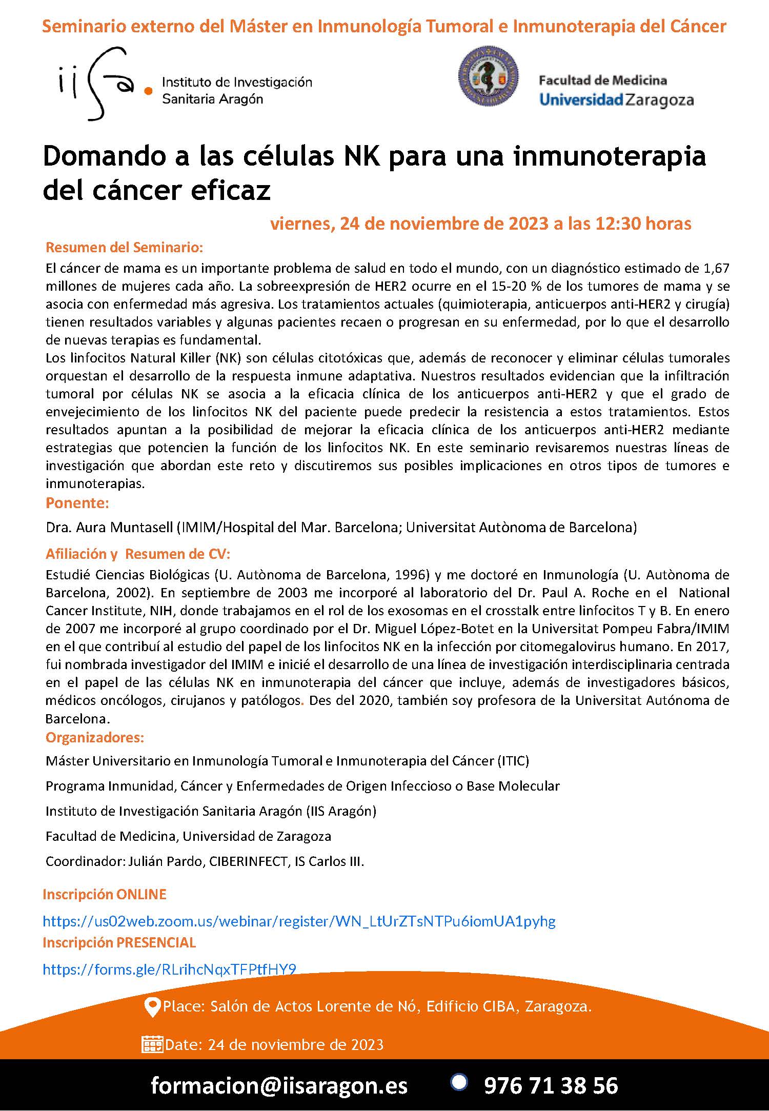 Los linfocitos Natural Killer (NK) son células citotóxicas que, además de reconocer y eliminar células tumorales orquestan el desarrollo de la respuesta inmune adaptativa. Nuestros resultados evidencian que la infiltración tumoral por células NK se asocia a la eficacia clínica de los anticuerpos anti-HER2 y que el grado de envejecimiento de los linfocitos NK del paciente puede predecir la resistencia a estos tratamientos. Estos resultados apuntan a la posibilidad de mejorar la eficacia clínica de los anticuerpos anti-HER2 mediante estrategias que potencien la función de los linfocitos NK. En este seminario revisaremos nuestras líneas de investigación que abordan este reto y discutiremos sus posibles implicaciones en otros tipos de tumores e inmunoterapias.