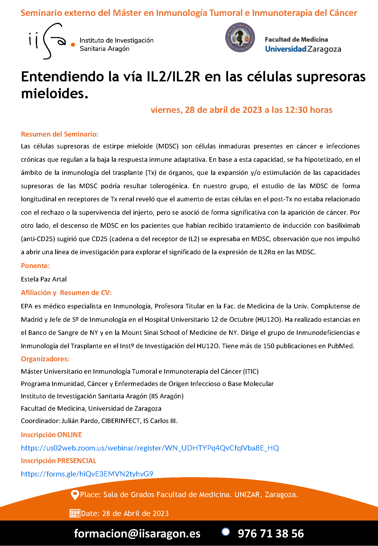 El Instituto de Investigación Sanitaria Aragón en colaboración con la Universidad de Zaragoza organizan el viernes, 28 de abril de 2023 a las 12:30 horas el Seminario Biomédico: «Entendiendo la vía IL2/IL2R en las células supresoras mieloides.».