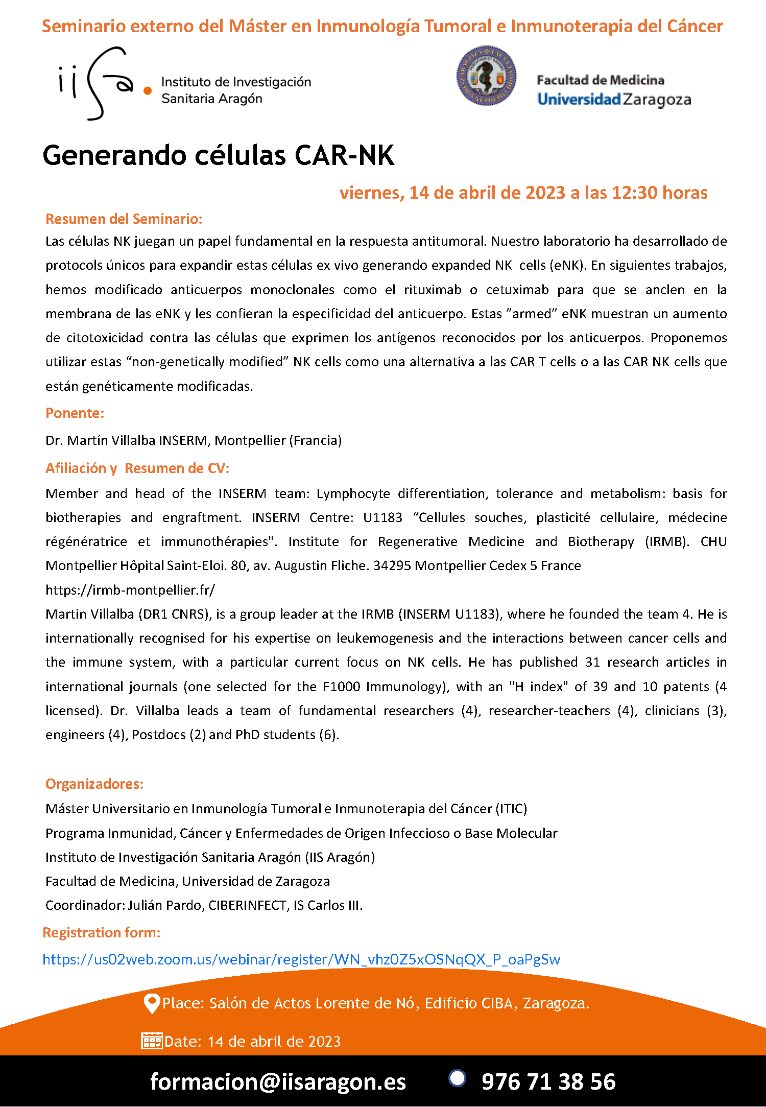 El Instituto de Investigación Sanitaria Aragón en colaboración con la Universidad de Zaragoza organizan el 14 de abril 2023 a las 12:30 el Seminario Biomédico «Seminario Biomédico: «Generando células CAR-NK»».