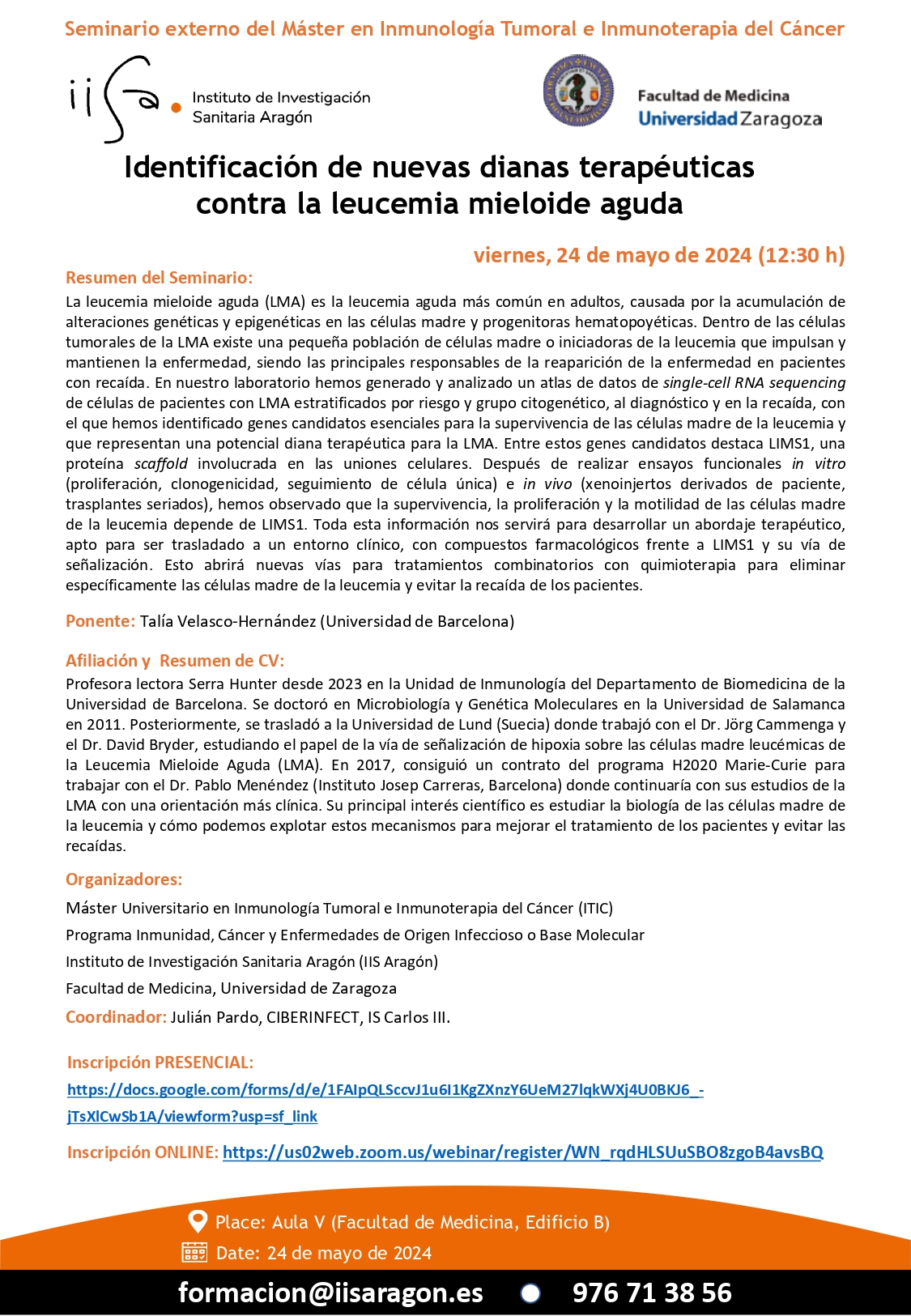 El Instituto de Investigación Sanitaria Aragón, en colaboración con el Máster en Inmunología Tumoral e Inmunoterapia del Cáncer de la Universidad de Zaragoza, organizan el SEMINARIO BIOMÉDICO “Identificación de nuevas dianas terapéuticas contra la leucemia mieloide aguda”.