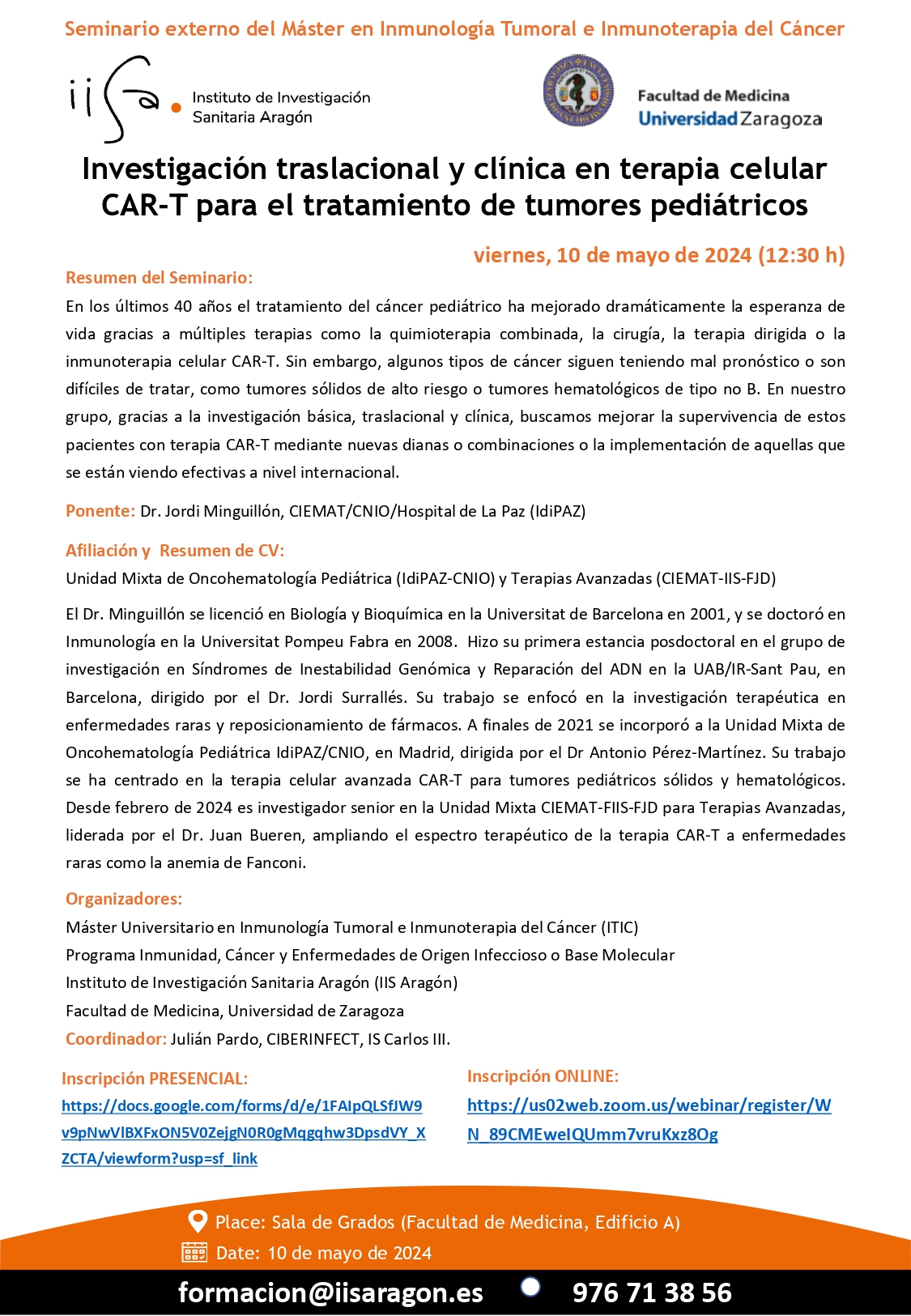 El Instituto de Investigación Sanitaria Aragón, en colaboración con el Máster en Inmunología Tumoral e Inmunoterapia del Cáncer de la Universidad de Zaragoza, organizan el SEMINARIO BIOMÉDICO “Investigación traslacional y clínica en terapia celular CAR-T para el tratamiento de tumores pediátricos”.