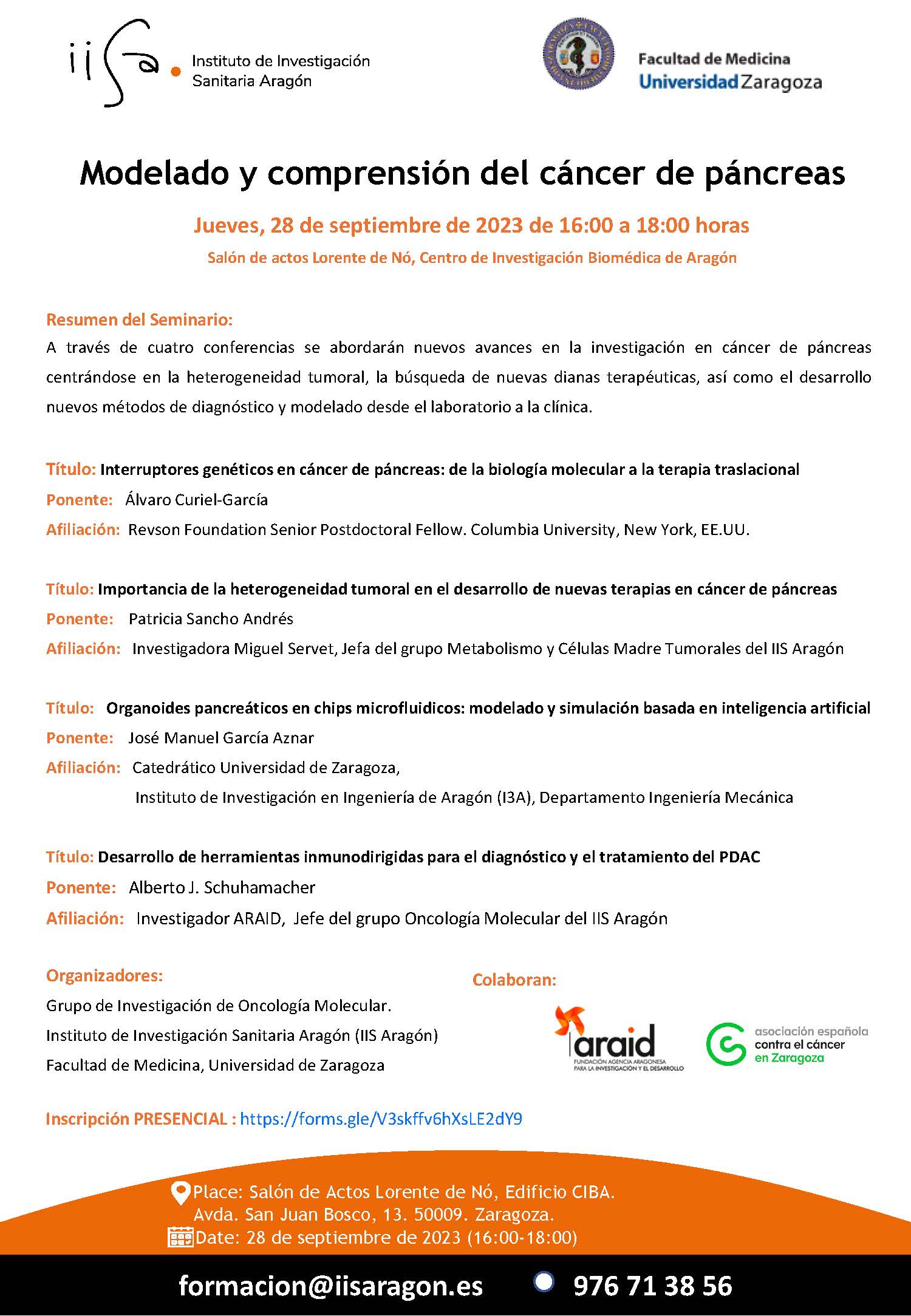 El Instituto de Investigación Sanitaria Aragón en colaboración con la Facultad de Medicina de la Universidad de Zaragoza, Fundación Agencia Aragonesa para la Investigación y el Desarrollo (ARAID) y Asociación Española Contra el Cáncer Zaragoza organizan el Jueves 28 de septiembre de 2023 de 16:00 a 18:00 horas el Seminario Biomédico: «Modelado y comprensión del cáncer de páncreas«.