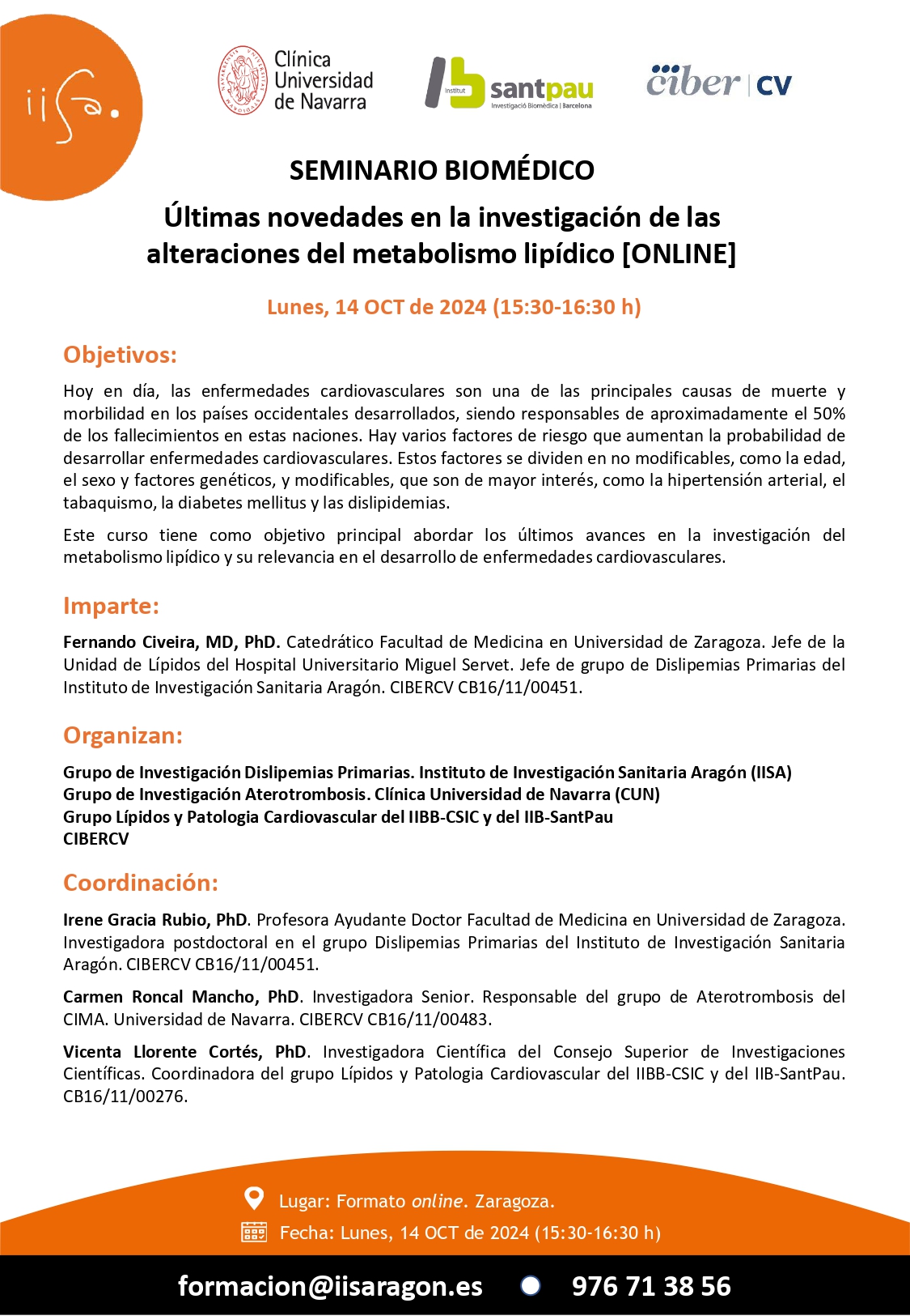 Seminario Biomédico (ONLINE): «Últimas novedades en la investigación de las alteraciones del metabolismo lipídico»