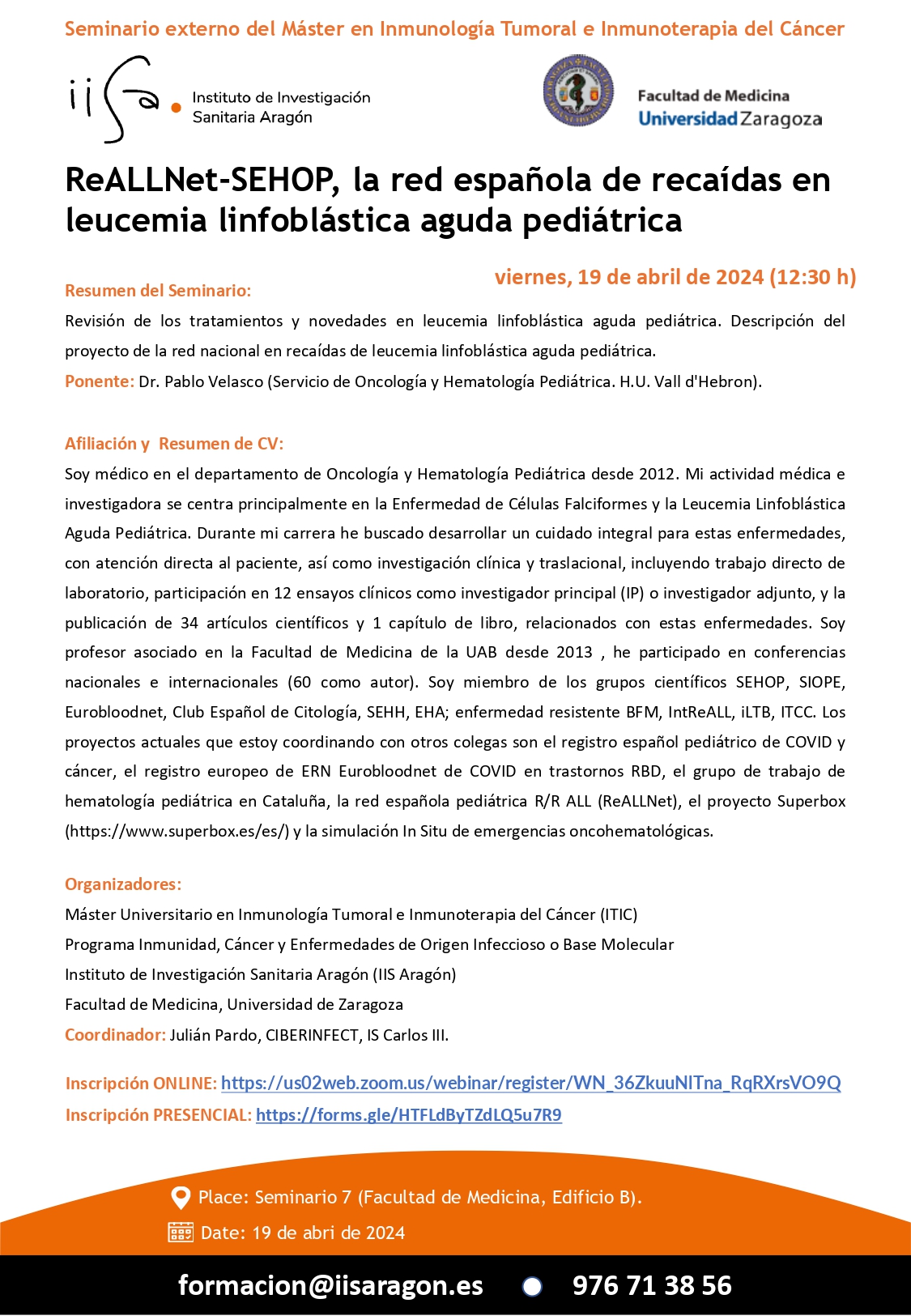 El Instituto de Investigación Sanitaria Aragón en colaboración con el Máster Universitario en Inmunología Tumoral e Inmunoterapia del Cáncer (ITIC), Programa Inmunidad, Cáncer y Enfermedades de Origen Infeccioso o Base Molecular y la Facultad de Medicina (Universidad de Zaragoza) organizan el SEMINARIO BIOMÉDICO “ReALLNet-SEHOP, la red española de recaídas en leucemia linfoblástica aguda pediátrica”.