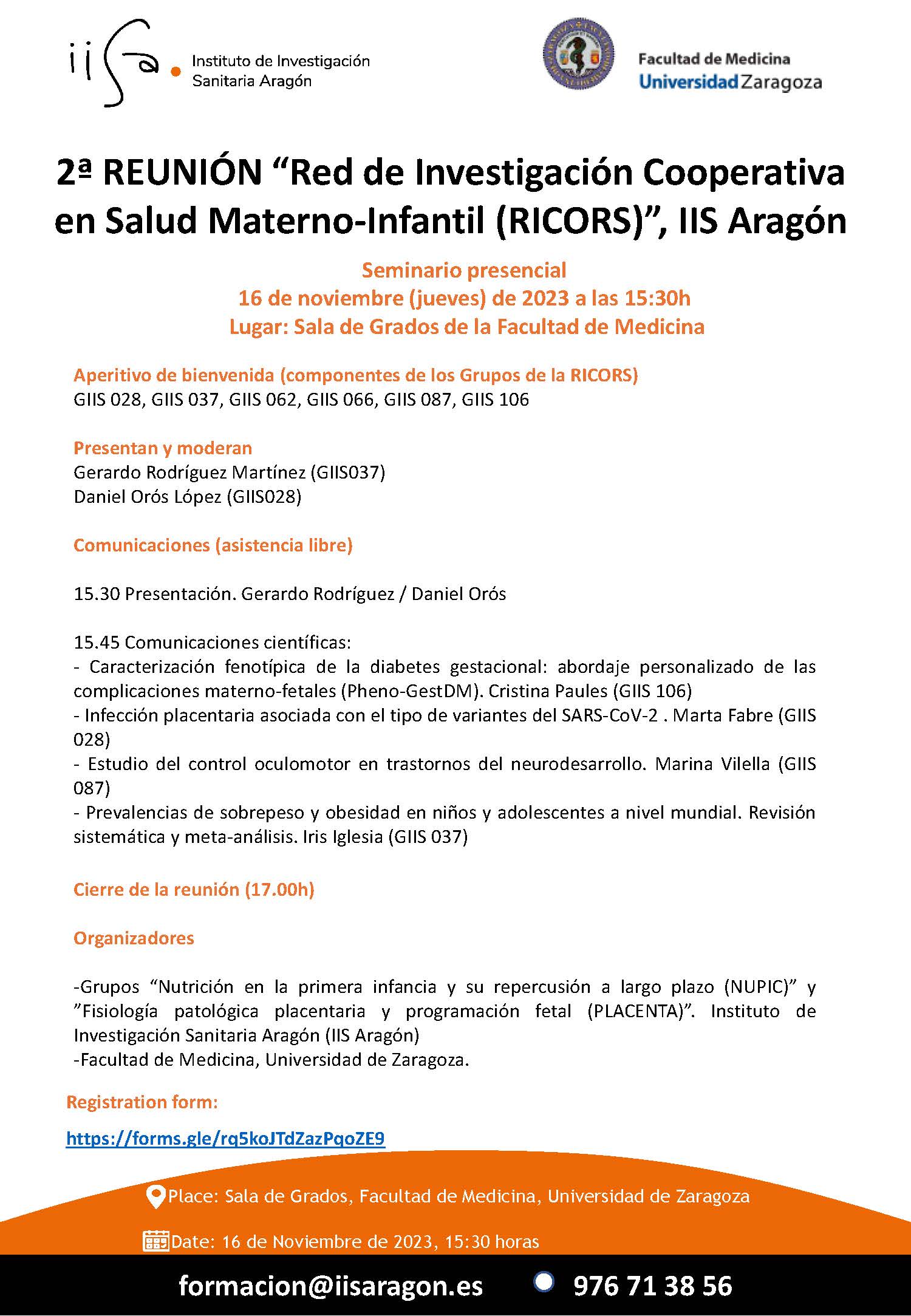El Instituto de Investigación Sanitaria Aragón en colaboración con los Grupos “Nutrición en la primera infancia y su repercusión a largo plazo (NUPIC)” y ”Fisiología patológica placentaria y programación fetal (PLACENTA)” y Facultad de Medicina de la Universidad de Zaragoza organizan el Jueves 16 de noviembre de 2023 de 15:30 a 17:00 horas la 2ª REUNIÓN “Red de Investigación Cooperativa en Salud Materno-Infantil (RICORS)”, IIS Aragón