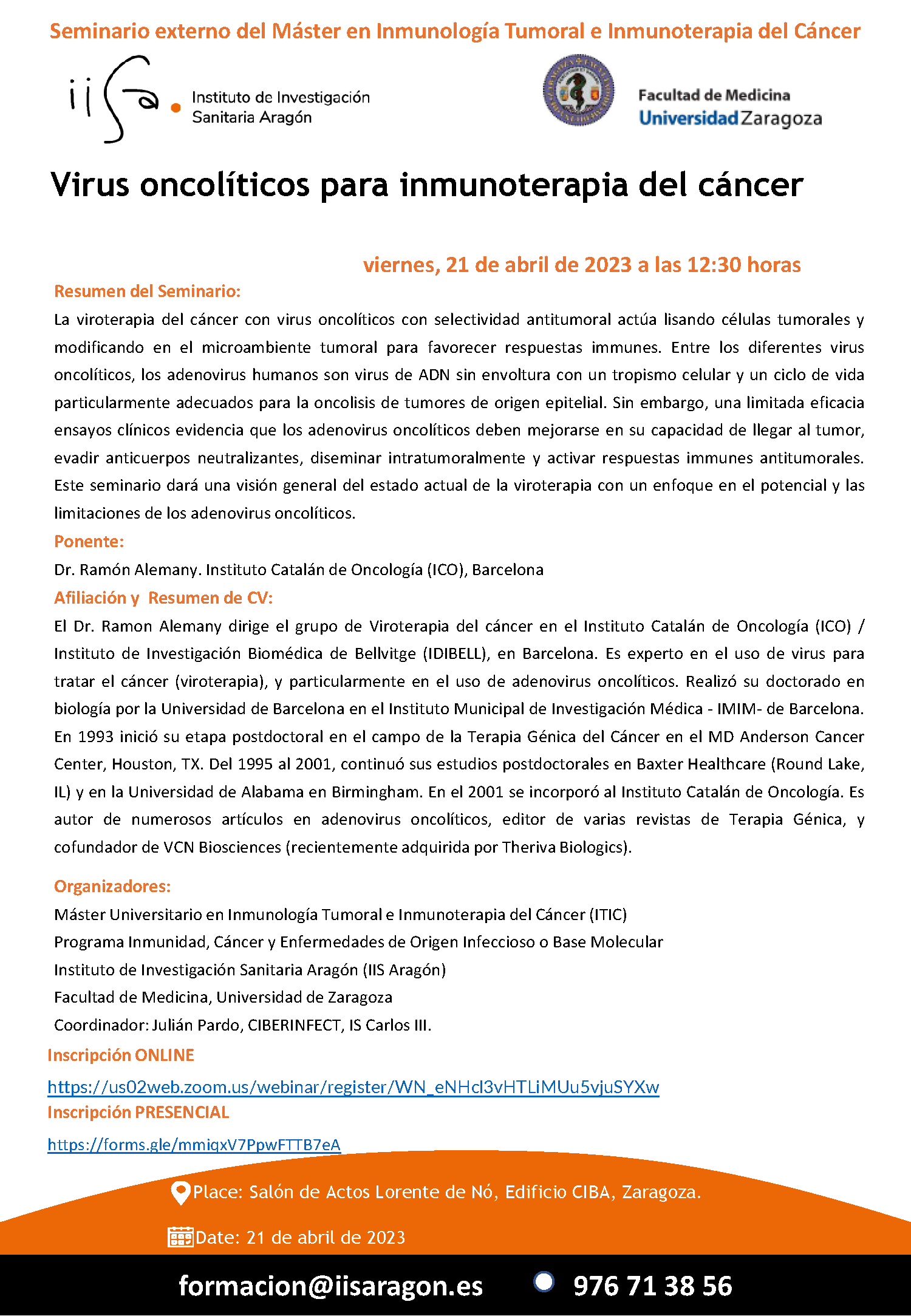 El Instituto de Investigación Sanitaria Aragón en colaboración con la Universidad de Zaragoza organizan el viernes, 21 de abril de 2023 a las 12:30 horas el Seminario Biomédico: «Virus oncolíticos para inmunoterapia del cáncer».