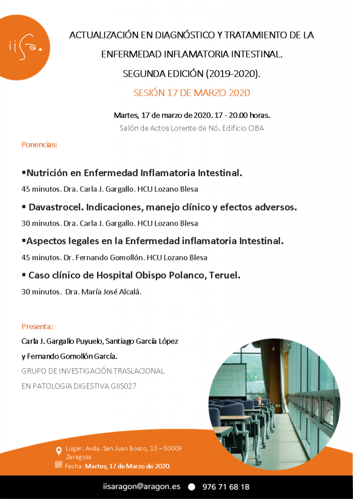 El próximo martes, 17 de Marzo de 2020. De las 17:00 horas hasta las 20:00 horas tendrá lugar el Seminario Biomédico «ACTUALIZACIÓN EN DIAGNÓSTICO Y TRATAMIENTO DE LA ENFERMEDAD INFLAMATORIA INTESTINAL. SEGUNDA EDICIÓN (2019-2020). SESIÓN 17 MARZO 2020».