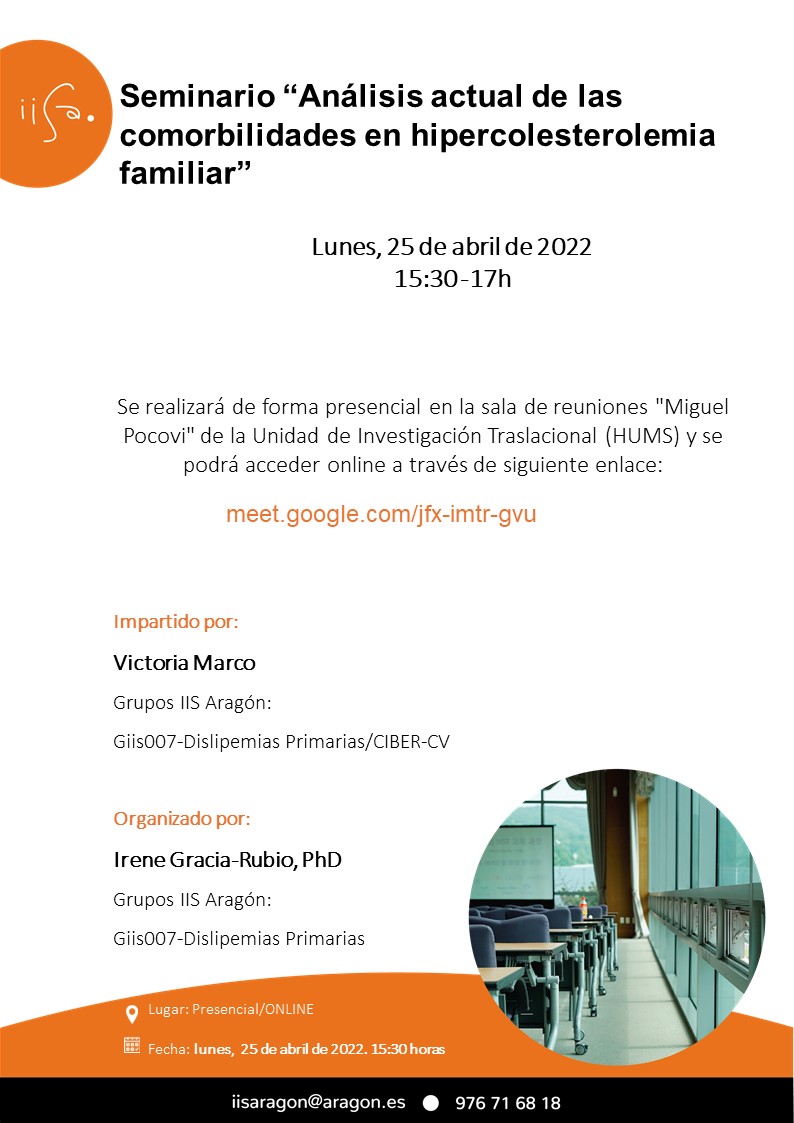 El próximo Lunes 28 de Abril de 2022 a las 15:30 horas tendrá lugar el Seminario Científico “Análisis actual de las comorbilidades en hipercolesterolemia familiar”