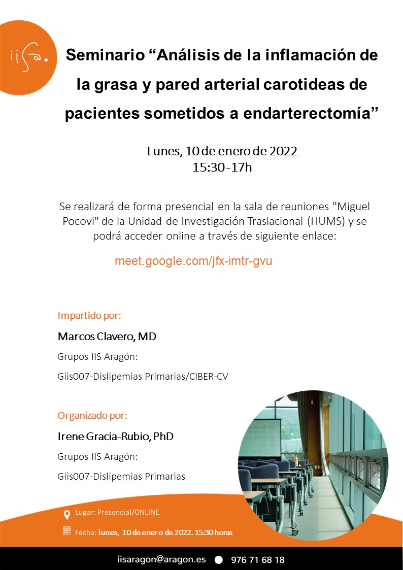 El próximo Lunes 10 de enero de 2022 de 15:30 a 17:00 horas tendrá lugar el Seminario Científico “Análisis de la inflamación de la grasa y pared arterial carotideas de pacientes sometidos a endarterectomía”