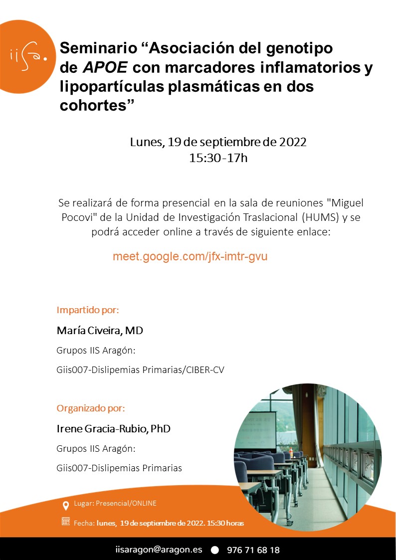 El próximo Lunes 19 de Septiembre de 2022 a las 15:30 horas tendrá lugar el Seminario Científico “Asociación del genotipo de APOE con marcadores inflamatorios y lipopartículas plasmáticas en dos cohortes”