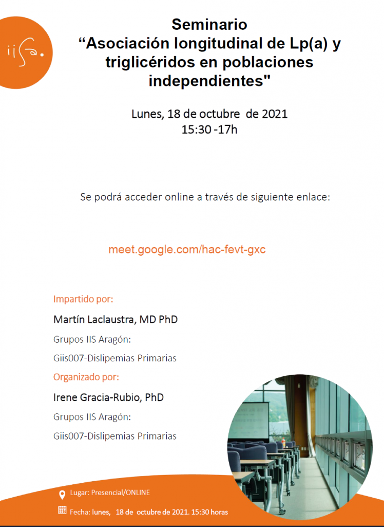 El próximo Lunes 18 de octubre de 2021 de 15:30 a 17:00 horas tendrá lugar el Seminario Científico “Asociación longitudinal de Lp(a) y triglicéridos en poblaciones independientes”