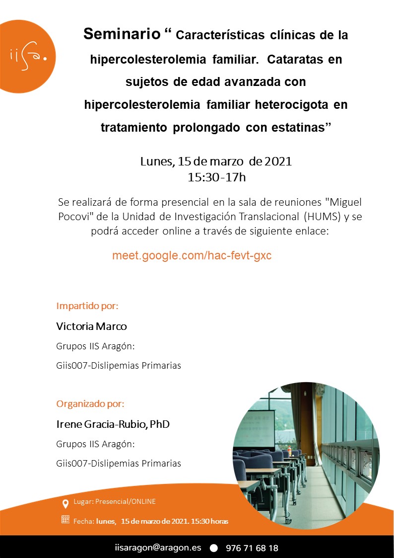 El próximo Lunes, 15 de Marzo de 2021 a las 15:30 horas tendrá lugar el Seminario Científico «Características clínicas de la hipercolesterolemia familiar. Cataratas en sujetos de edad avanzada con hipercolesterolemia familiar heterocigota en tratamiento prolongado con estatinas».