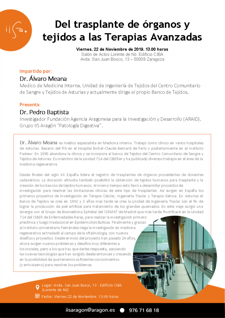 El próximo lunes, 22 de Noviembre a las 13.00 horas tendrá lugar el Seminario Biomédico «Del trasplante de órganos y tejidos a las Terapias Avanzadas”, impartido por el Dr. Álvaro Meana.