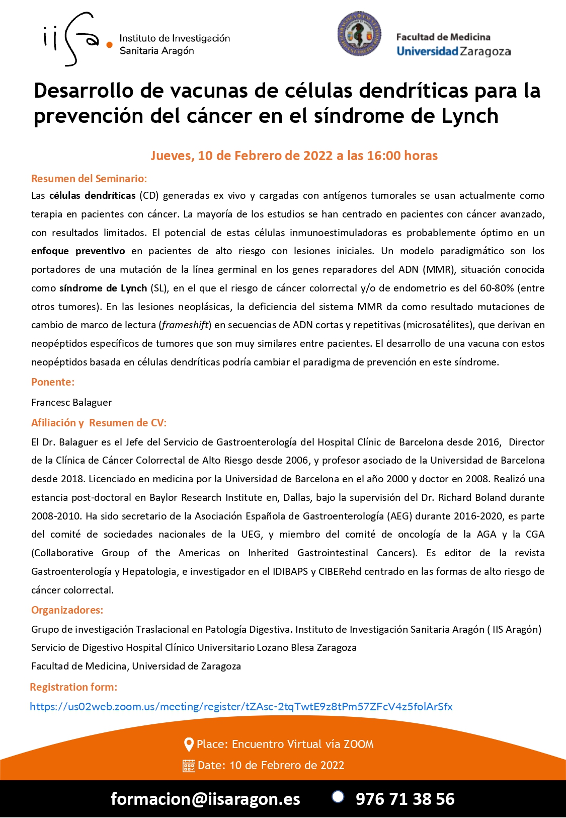 Seminario Científico “Desarrollo de vacunas de células dendríticas para la prevención del cáncer en el síndrome de Lynch”