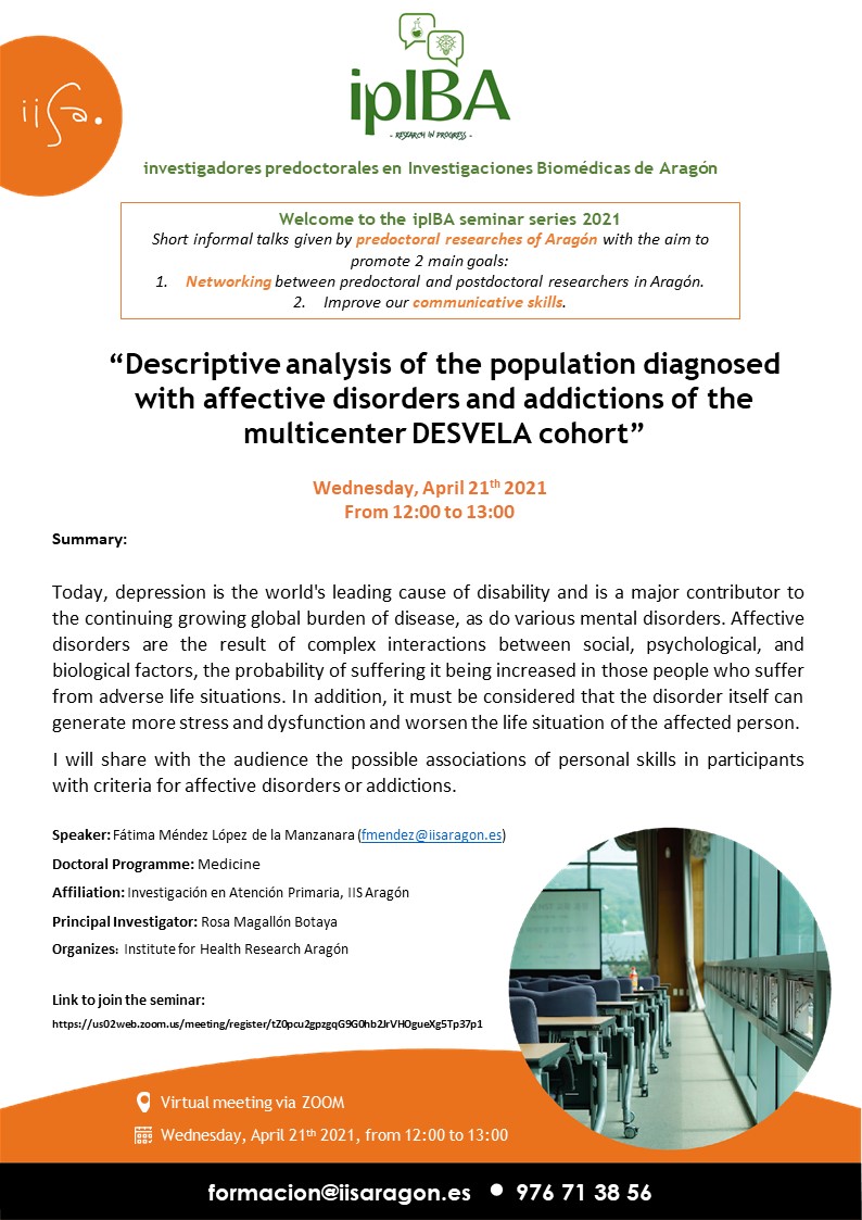 El próximo Miércoles, 2 de Abril de 2021 de 12:00 a 13:00 horas tendrá lugar el Seminario Científico “Descriptive analysis of the population diagnosed with affective disorders and addictions of the multicenter DESVELA cohort”