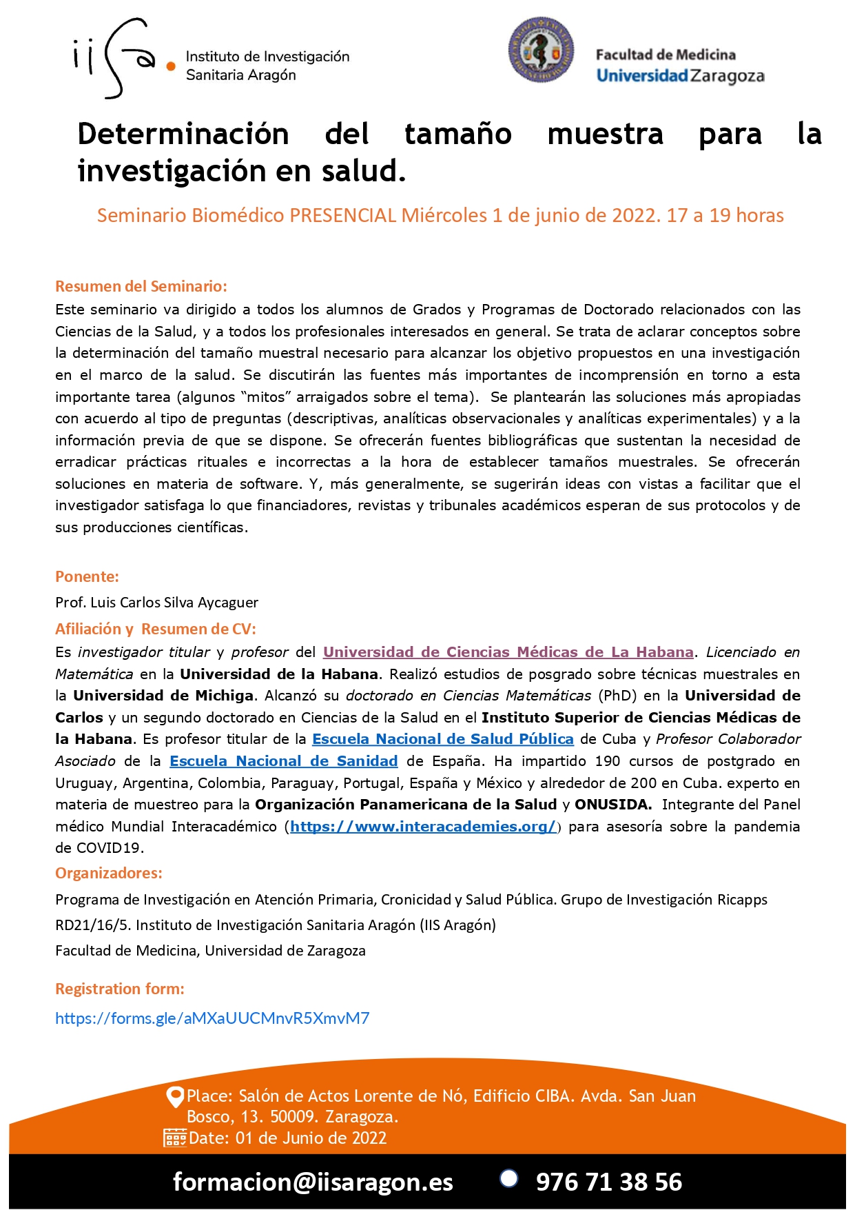 El próximo Miércoles 1 de Junio de 2022 de 17:00 a 19:00 horas tendrá lugar el Seminario Científico “Determinación del tamaño muestra para la investigación en salud”