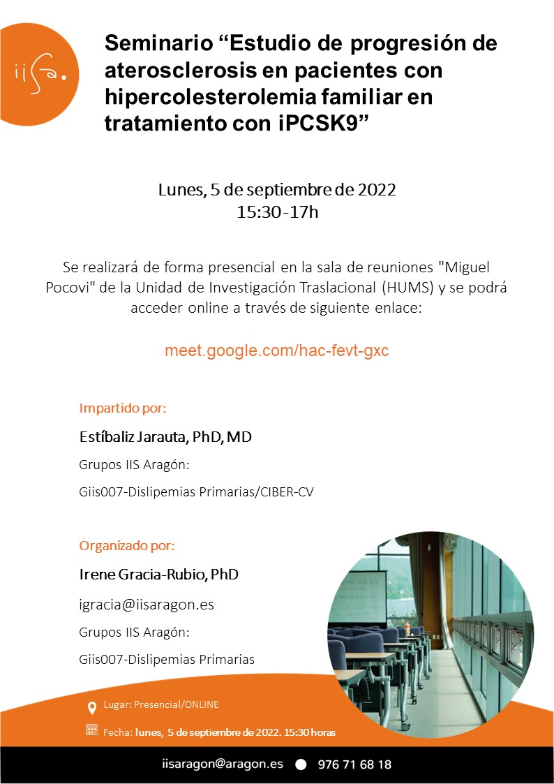 El próximo Lunes 5 de Septiembrede 2022 a las 15:30 horas tendrá lugar el Seminario Científico “Estudio de progresión de aterosclerosis en pacientes con hipercolesterolemia familiar en tratamiento con iPCSK9”