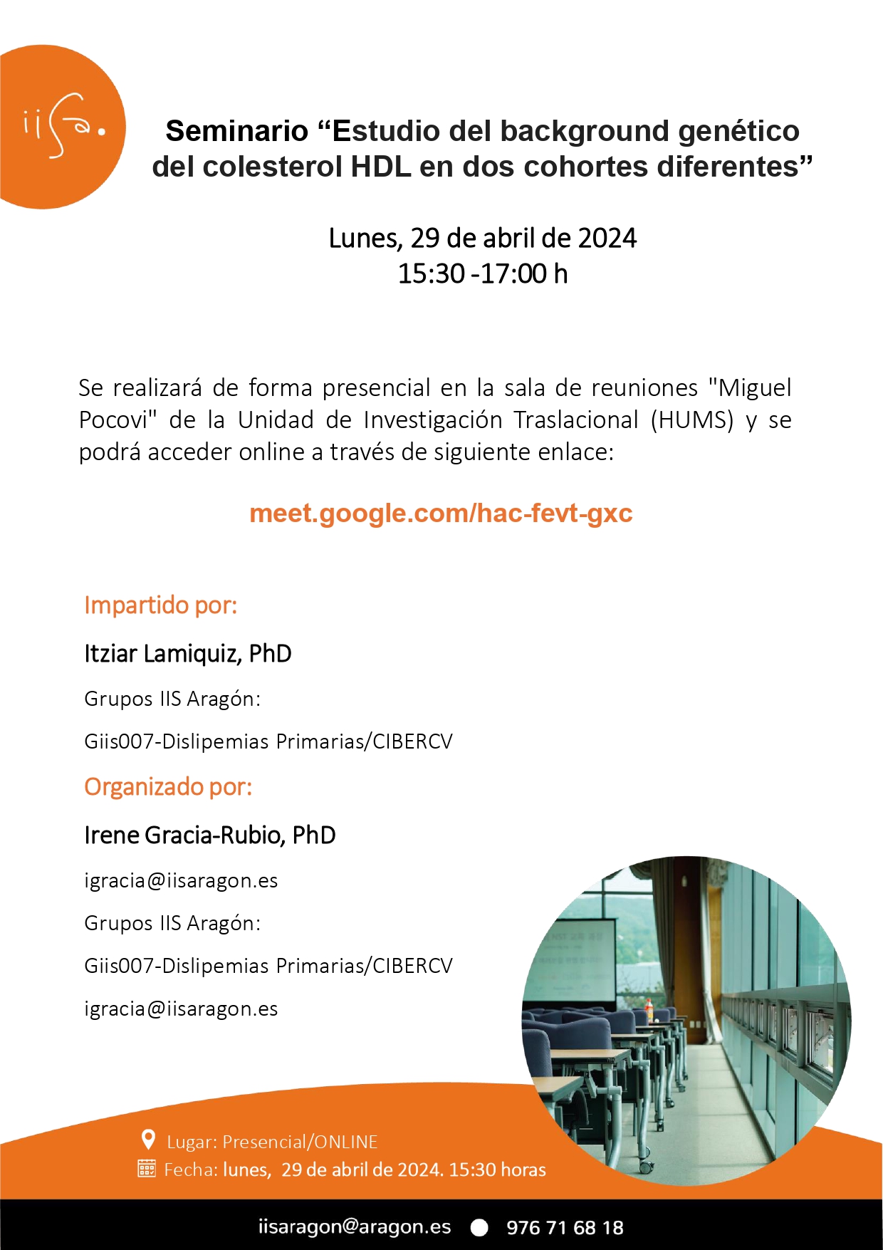 El Instituto de Investigación Sanitaria Aragón en colaboración con el Grupo GIIS 007-Dislipemias Primarias/CIBERCV organizan el Seminario Científico: “Estudio del background genético del colesterol HDL en dos cohortes diferentesel lunes 29 de abril de 2024 a las 15:30h.