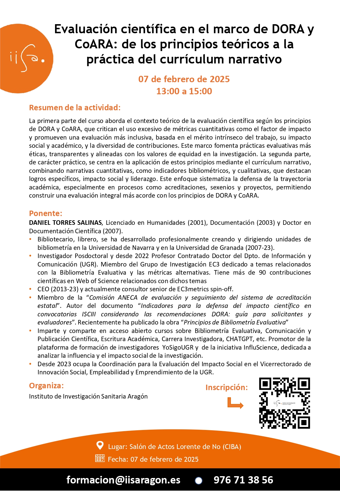 Desde el área de Formación del Instituto de Investigación Sanitaria Aragón te animamos a participar en el seminario científico «Evaluación científica en el marco de DORA y CoARA: de los principios teóricos a la práctica del currículum narrativo», donde se abordá el contexto teórico de la evaluación científica según los principios de DORA y CoARA y se trabajará su aplicación mediante el currículum narrativo, combinando narrativas cuantitativas y cualitativas.