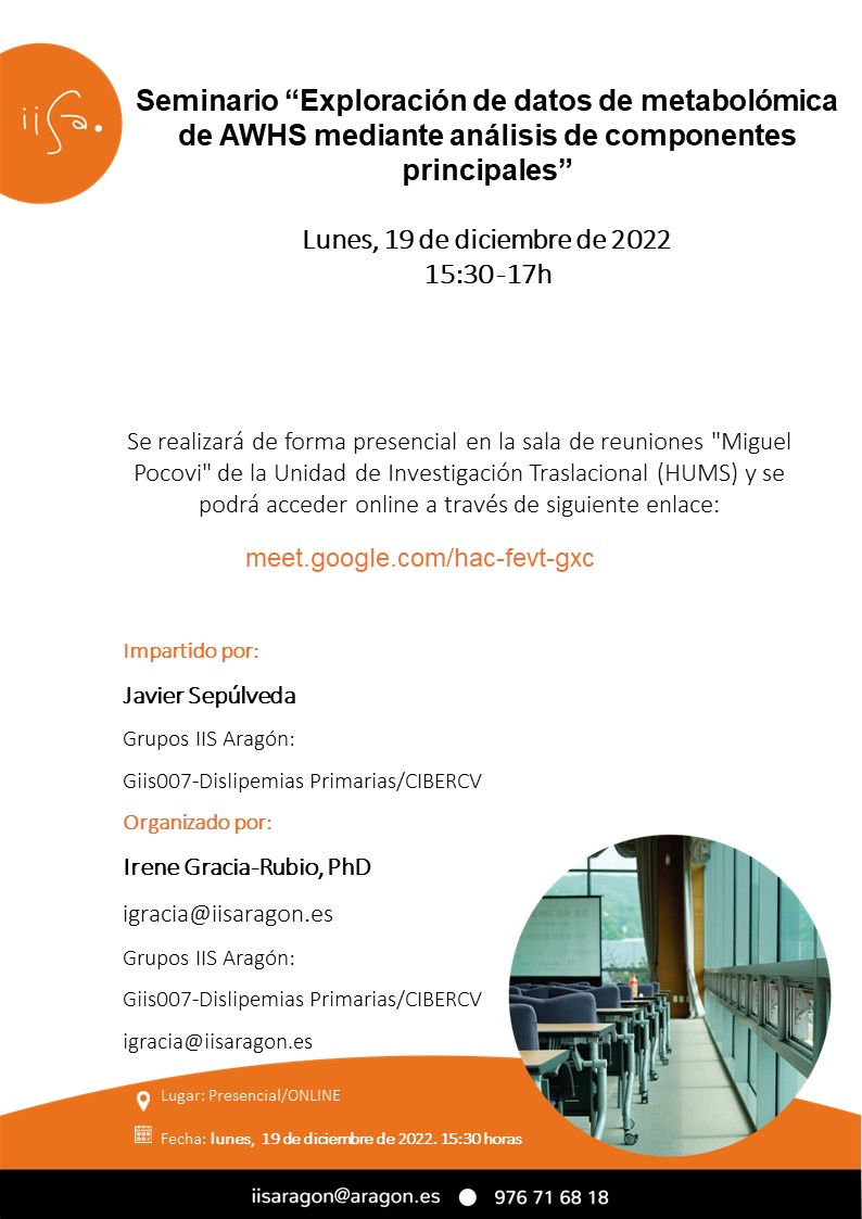 El próximo Lunes, 19 de diciembre de 2022 a las 15:30 h tendrá lugar el Seminario Científico “Exploración de datos de metabolómica de AWHS mediante análisis de componentes principales»