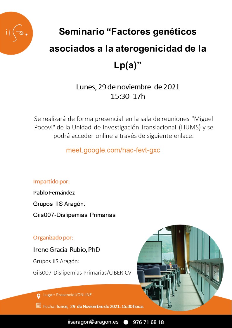 El próximo Lunes 29 de noviembre de 2021 de 15:30 a 17:00 horas tendrá lugar el Seminario Científico “Factores genéticos asociados a la aterogenicidad de la Lp(a)”