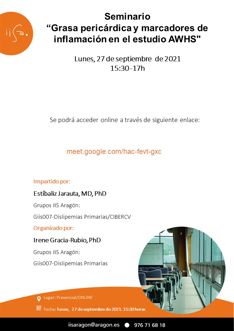 El próximo Lunes 27 de septiembre de 2021 de 15:30 a 17:00 horas tendrá lugar el Seminario Científico “Seminario Científico “Grasa pericárdica y marcadores de inflamación en el estudio AWHS”.