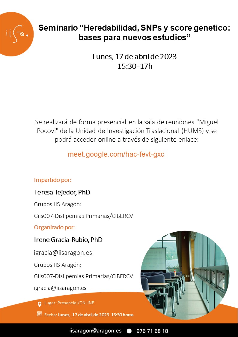El Instituto de Investigación Sanitaria Aragón en colaboración con el Grupo GIIS 007-Dislipemias Primarias/CIBERCV organizan el Seminario Científico: «Heredabilidad, SNPs y score genetico: bases para nuevos estudios» el lunes 17 de abril a las 15:30h.