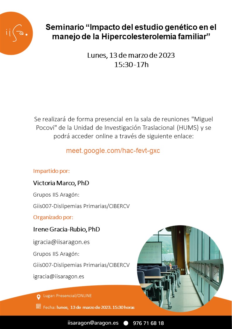 Place: Sala de reuniones «Miguel Pocovi» de la unidad de Investigación Traslacional (HUMS), Zaragoza el Lunes, 13 de marzo de 2023 a las 15:30 horas